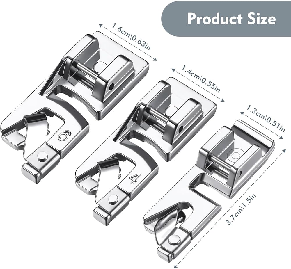 [كمية كافية]: تتضمن هذه المجموعة 3 قطع من القدم الضاغطة الملفوفة بثلاثة أحجام - قطعة واحدة مقاس 3 مم، وقطعة واحدة مقاس 4 مم، وقطعتين مقاس 6 مم. الخياطة بهذه القدم ليست صعبة ولكنها قد تتطلب القليل من التدريب. إنها مناسبة للأقمشة الرقيقة ويمكن استخدامها لإنشاء أنماط جميلة. يرجى التحقق من معلومات المقاس قبل إجراء عملية الشراء.