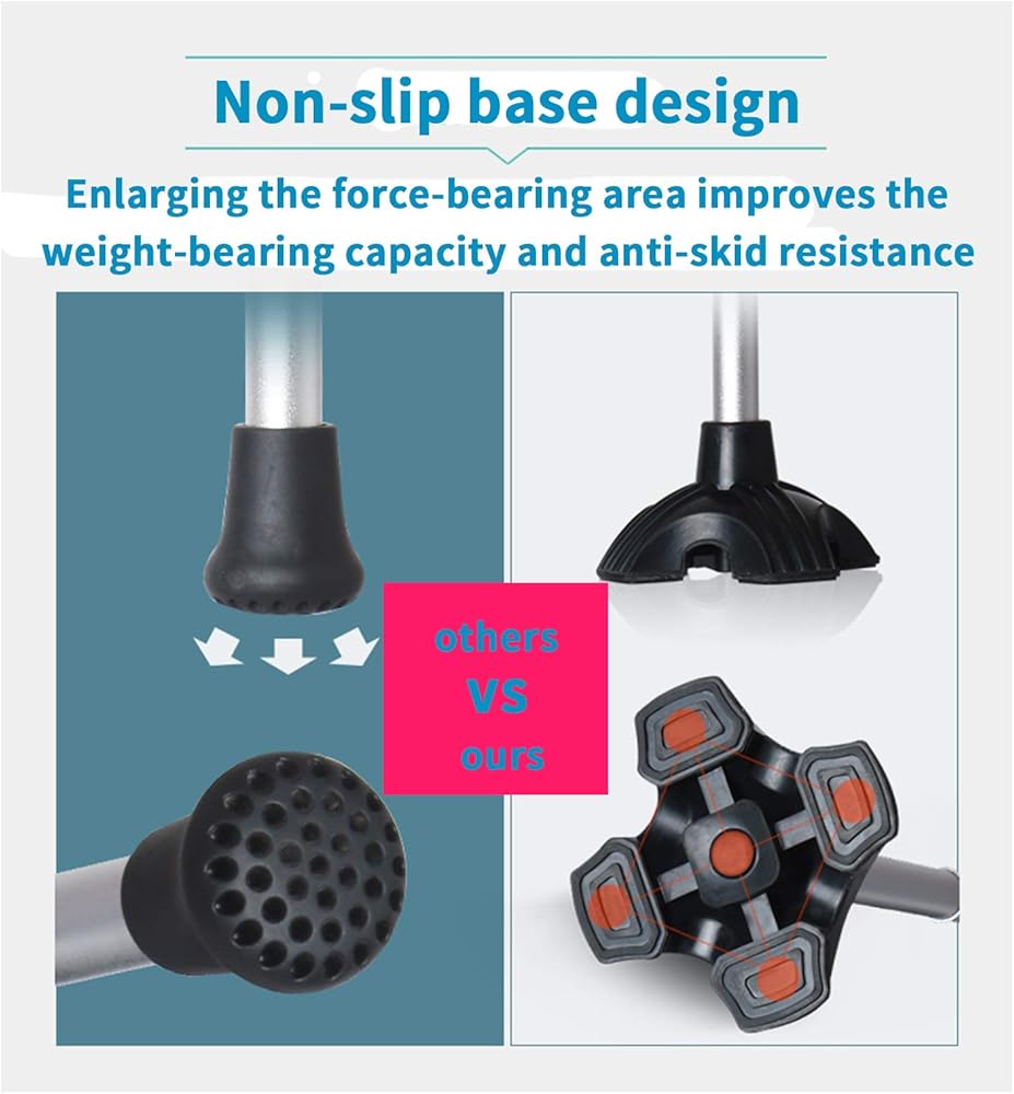 • توازن وثبات أكبر: يوفر توازنًا وثباتًا أكبر على أي سطح عند تثبيته بشكل صحيح على العصا القياسية أو القابلة للطي الحالية. طرف العصا ينثني أثناء المشي، ويمتص صدمة كل خطوة لتقليل التعب في اليد والمعصم بشكل فعال.