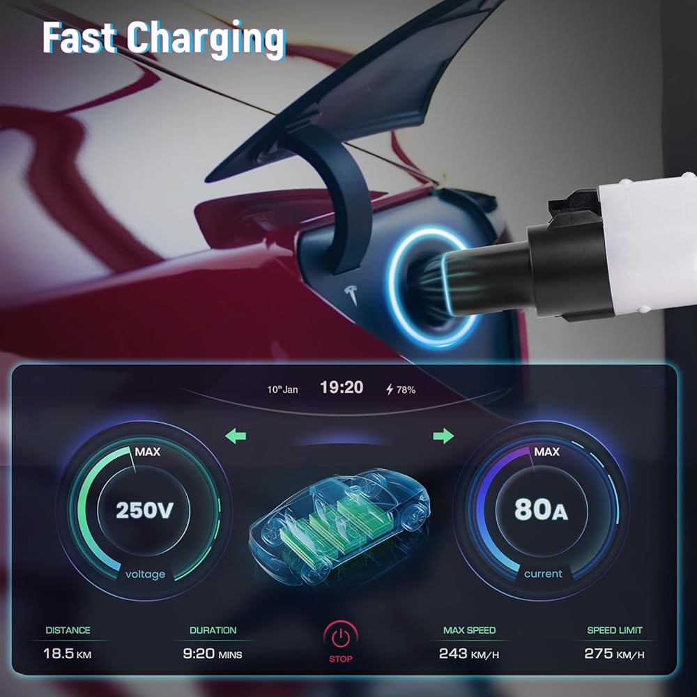• شحن سريع: يتميز محول تيسلا إلى j1772 بتيار وجهد عالي، وقد تم تصنيفه لدعم ما يصل إلى 80 أمبير لتشغيل مستقر عند 110 فولت - 250 فولت. توفير شحن سريع كامل في غضون ساعات مع شحن التيار المتردد من المستوى 2، استمتع بتجربة شحن أسرع. متوافق أيضًا مع محطات الشحن من المستوى 1.