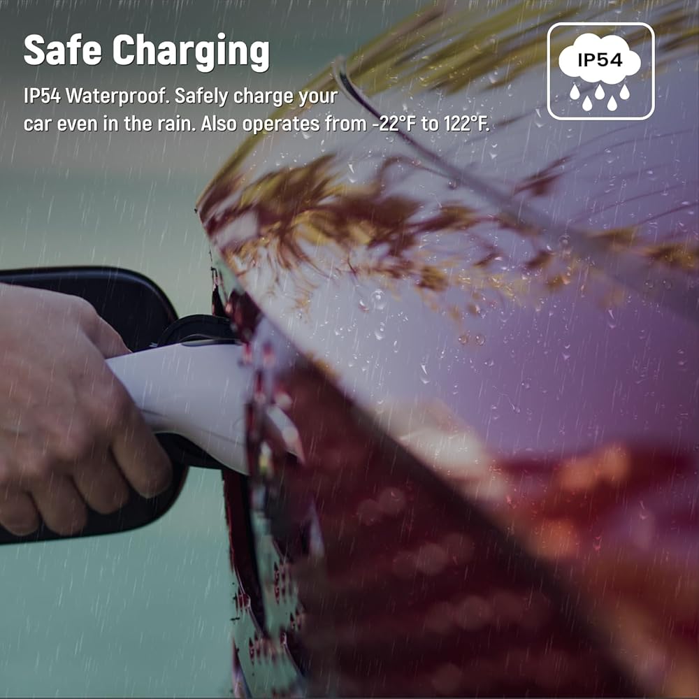 • مواد ذات جودة عالية: مصنوعة من مادة ABS عالية القوة لمتانة ممتازة والتوصيل الكهربائي. لقد اجتاز اختبارات صارمة، ويلبي معايير UL وCSA، وله تصنيف IP54 لمقاومة الماء، وهو قادر على العمل في درجات حرارة تتراوح من -22 درجة فهرنهايت إلى 122 درجة فهرنهايت. لا داعي للقلق بشأن الطقس، لذلك يمكن شحن سيارتك بأمان في أي مكان.