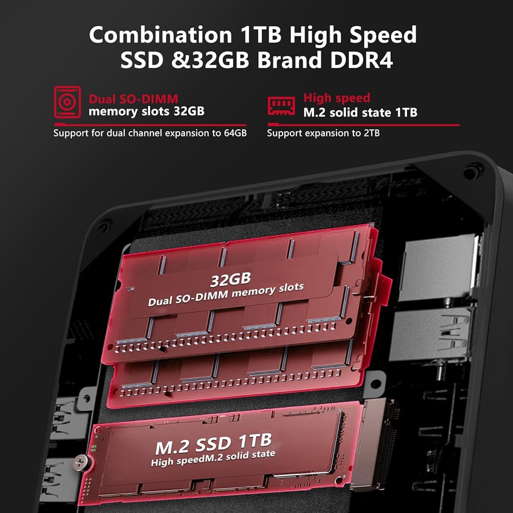 【ذاكرة تكوين 32 جيجابايت + تخزين 1 تيرابايت】يحتوي جهاز Bosgame Ryzen 7 mini PC P1 على ذاكرة وصول عشوائي DDR4 قياسية سعة 32 جيجابايت و1 تيرابايت M.2 SSD. مجهزة بفتحتين للذاكرة، يمكن توسيع ذاكرة الوصول العشوائي DDR4 بسعة 16 جيجابايت (بحد أقصى 3200 ميجا هرتز) حتى 32 جيجابايت من ذاكرة الوصول العشوائي لفتحة بطاقة واحدة وما يصل إلى 64 جيجابايت من ذاكرة الوصول العشوائي لفتحة البطاقة المزدوجة. ويمكنك توسيع مساحة التخزين باستخدام M.2 PCIE3.0 2280 SSD أو عبر محرك أقراص SATA HDD مقاس 2.5 بوصة للترقية إلى 2 تيرابايت كحد أقصى. يوفر التثبيت المسبق لذاكرة الوصول العشوائي الكبيرة ومحرك الأقراص SSD أداءً ممتازًا وتشغيلًا سلسًا عند القيام بأعمال التحميل الثقيلة.