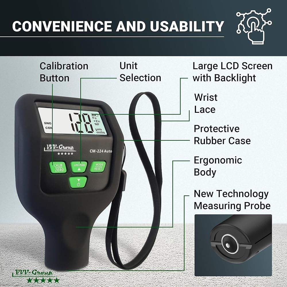 استخدامات واسعة - يمكن استخدام هذا الجهاز لتحديد متوسط سمك الطلاء على جسم السيارة، ويستخدمه الهواة والمحترفون في التصنيع وبناء السفن وورش العمل ومحلات الطلاء وصناعات الطائرات وفي صناعة السيارات وما إلى ذلك.