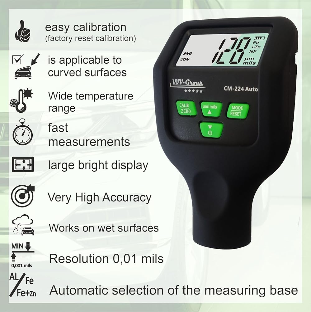 معايرة المصنع التلقائية - لقياس سطح السيارات، لا يمكن معايرة مقياس السُمك على الإطلاق، وإذا لزم الأمر، يمكنك حتى إعادة الضبط ويقوم مقياس السُمك بتنشيط معايرة المصنع