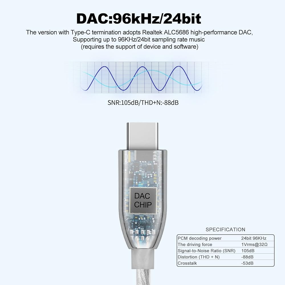 شريحة DAC عالية الدقة: يستخدم كابل ترقية صوت سماعة الرأس هذا شريحة DAC ذكية. يتميز باستهلاك منخفض للطاقة، وأداء فك تشفير ممتاز ومستقر، مقارنة بمعظم واجهات النوع c، يستخدم YYSEE معدل أخذ عينات أعلى من شريحة DAC الذكية 96 كيلو هرتز/24 بت، بحيث يتم استعادة الإشارة الافتراضية الأصلية بشكل أفضل، مما يزيد من تحسين جودة الصوت و استعادة أداء الصوت الأصلي لاستوديو التسجيل بشكل أكثر دقة.
