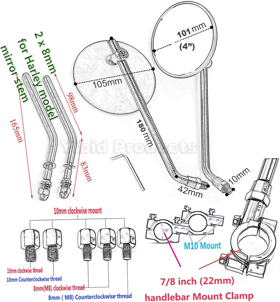 قطر الزجاج: معتمد (كما في الصورة) ; يناسب معظم الدراجات النارية Harrlay Honda Yamaha سوزوكي كاواساكي تشوبر بوبر مقاس 8 مم/10 مم