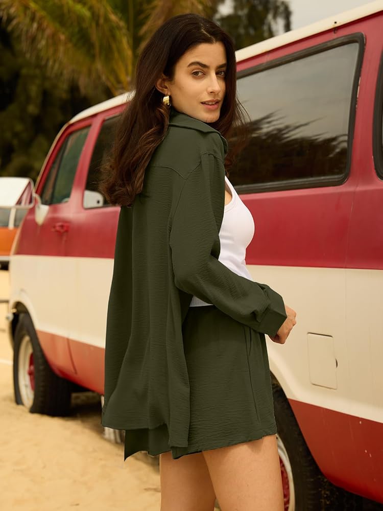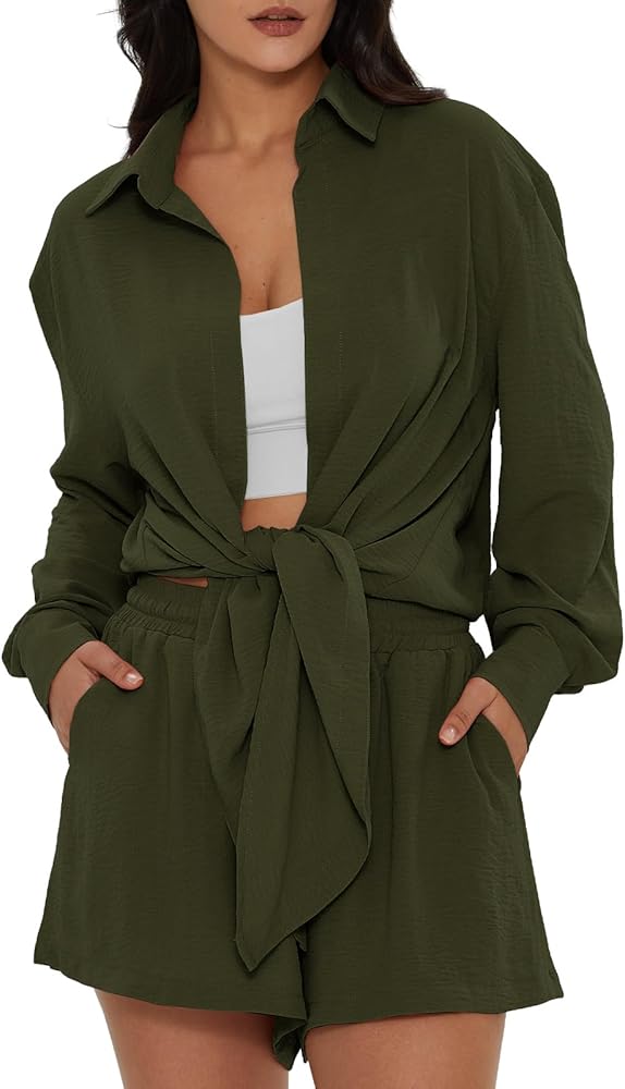 [المميزات]: مقاس كبير مع قصة جذابة وثنية وخط رقبة على شكل حرف V. تأتي هذه المجموعات المطابقة للسيدات بلون كلاسيكي ثابت. كم طويل، شورت مرن عالي الخصر، تصميم أمامي بعقدة يجعلك موجزًا وأنيقًا دون أن تفقد إحساس الموضة.