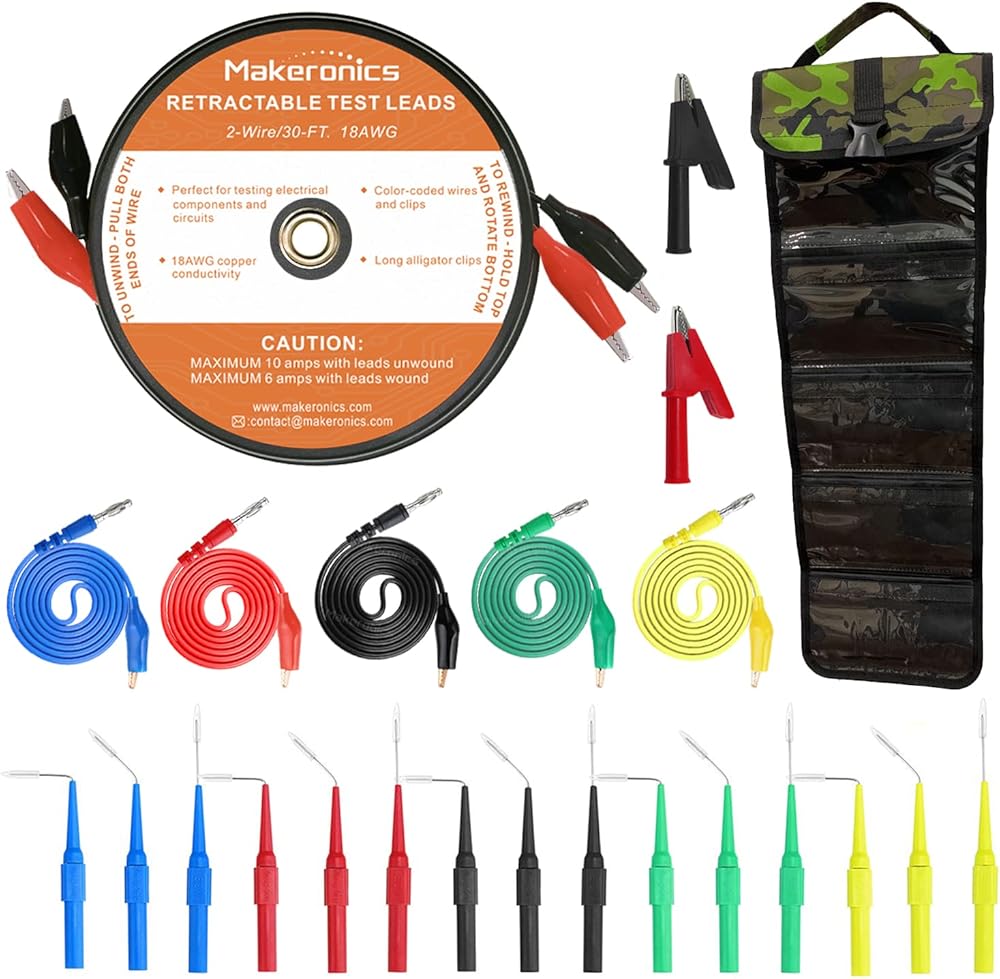 سلكان 30FT 18AWG يؤدي اختبار قابل للسحب مع حقيبة تخزين قابلة للطي | 15 قطعة مجسات خلفية 30 فولت | 5 قطع 4 مم من قابس الموز إلى أسلاك اختبار الدائرة بمشبك التمساح (39.37 بوصة) | قطعتان من مشابك التمساح