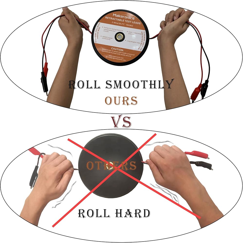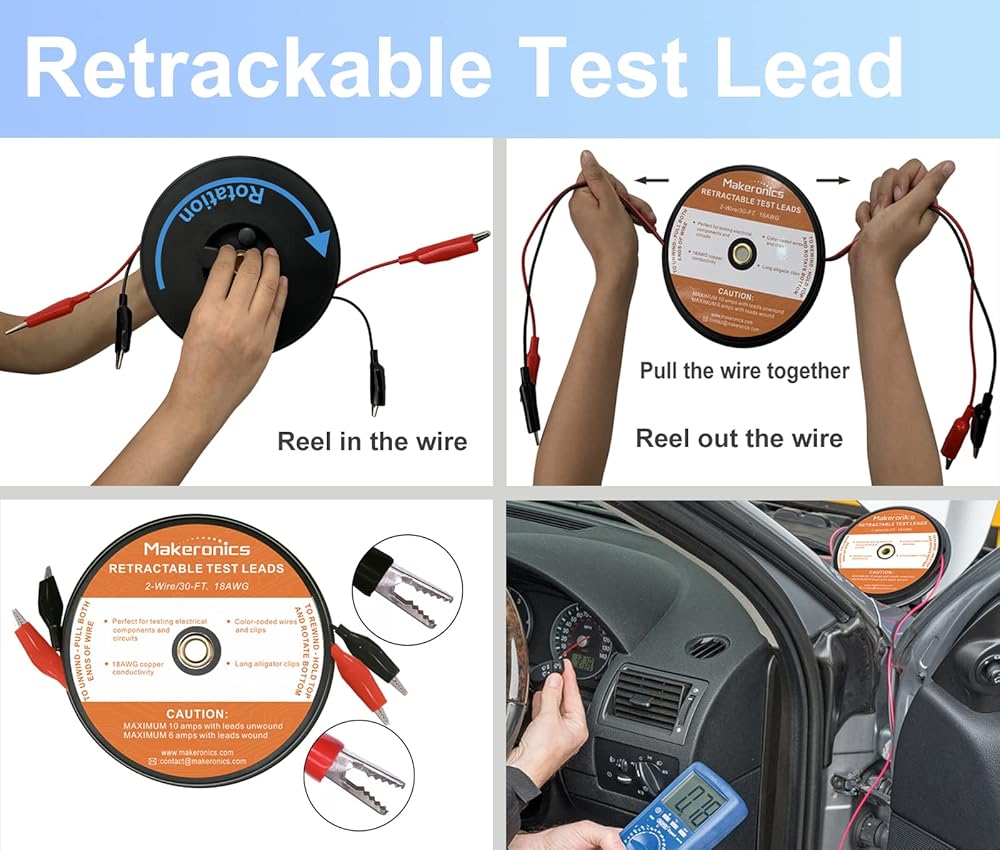 【سلاسل اختبار قابلة للسحب】 سلكان (أحمر وأسود) / طول 30 قدم لكل سلك / سلك نحاسي 18 AWG مع مشابك تمساح معزولة. اسحب للخارج وحافظ على الطول المطلوب، ويؤدي اختبار الترجيع إلى علبة الحماية الخاصة به عند عدم استخدامه للتخزين. يستخدم لاختبار الدوائر الكهربائية في السيارات والمقطورات والقوارب وغيرها.