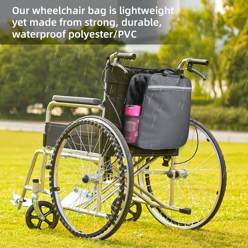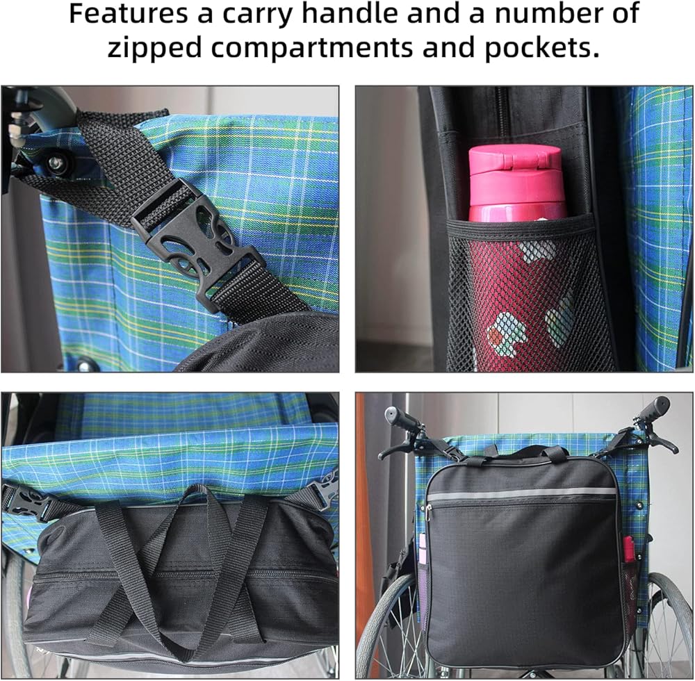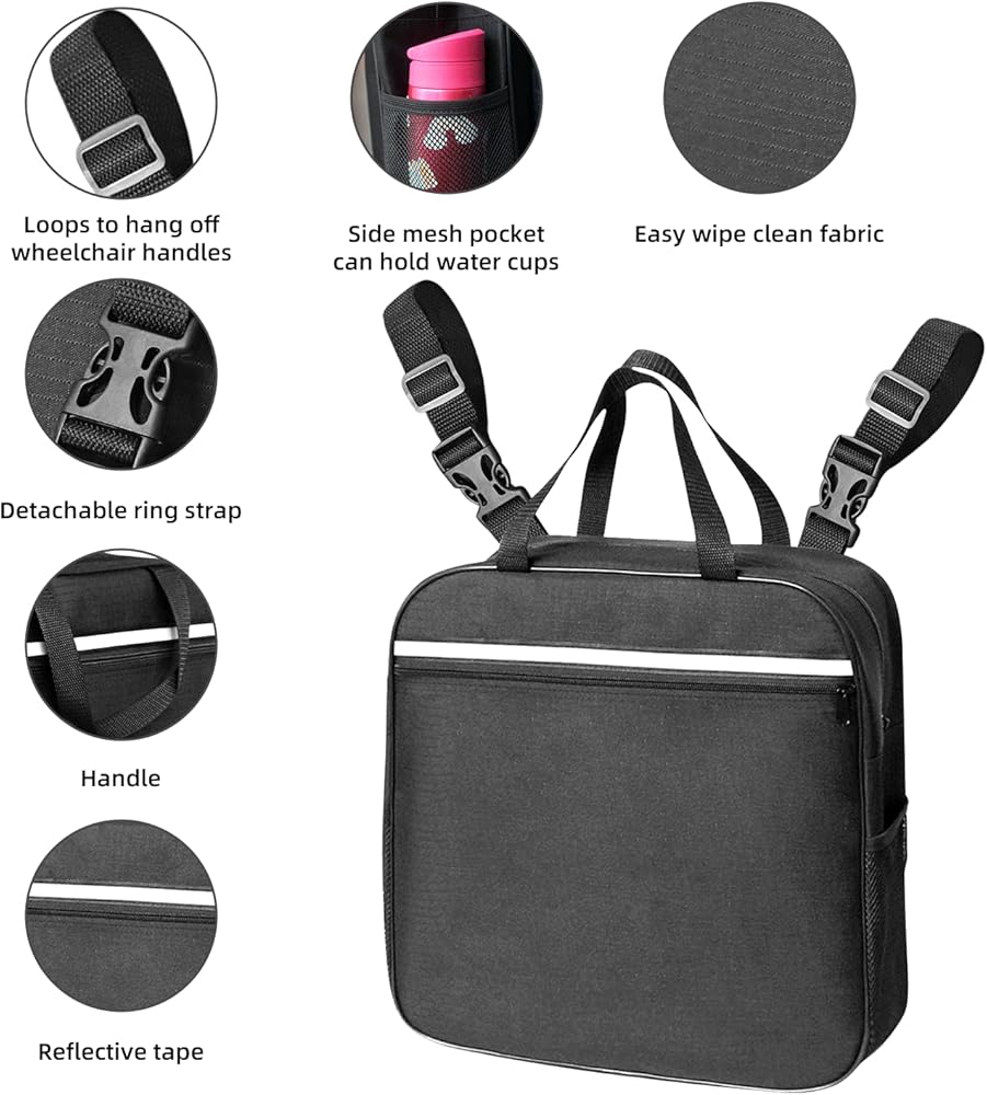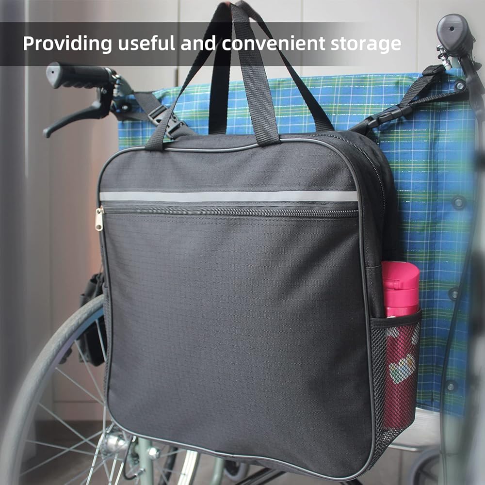 • ✅ Large capacity storage :2 side mesh bags for water cups, waterproof wheelchair accessories with zipper buckles on main and front pockets. 2 complete standard carrying handles and two special latches to fit wheelchair handles.