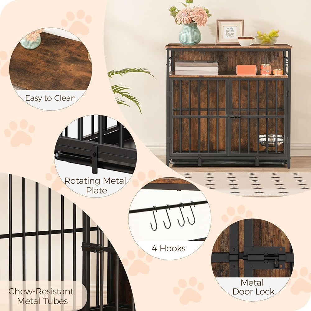 أثاث قفص كبير للكلاب، بيت للكلاب شديد التحمل مقاس 38.6 بوصة مع أوعية ورف تخزين، طاولة جانبية بنهاية قفص الكلاب الخشبي للكلاب الصغيرة/المتوسطة/الكبيرة، مقاومة للمضغ، بني ريفي DCHR10901
