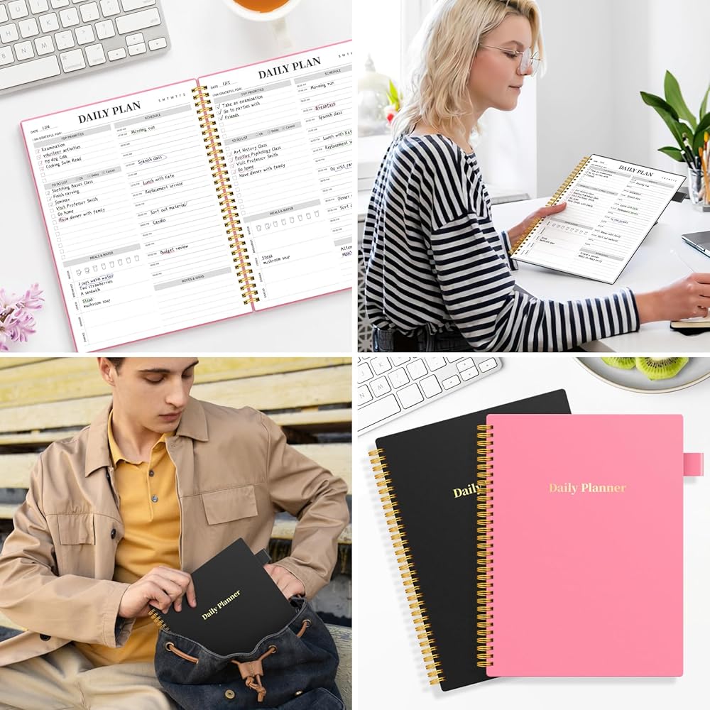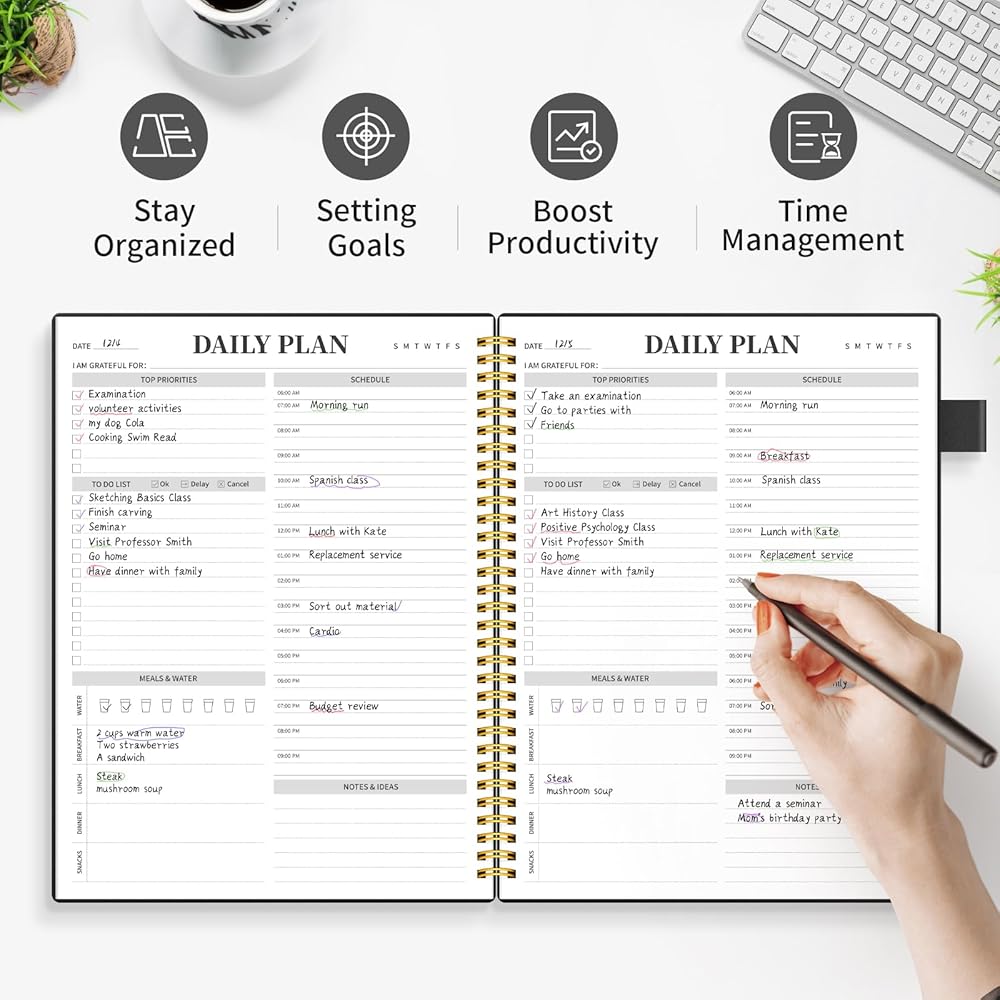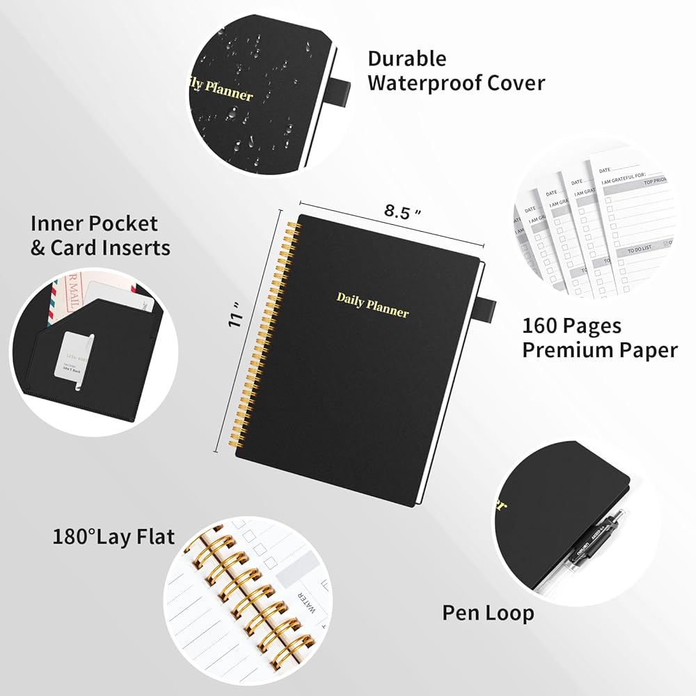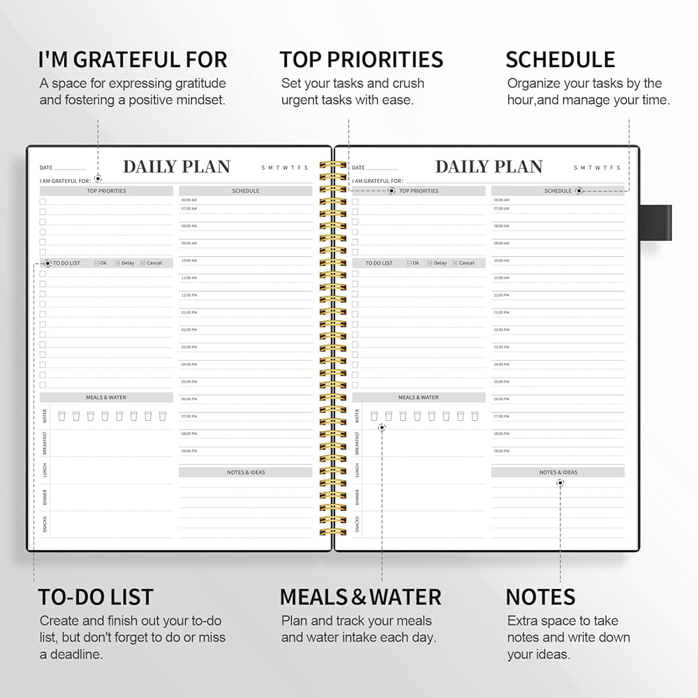 ابدأ الخطة في أي وقت: المخطط اليومي المكون من 160 صفحة غير مؤرخ، حتى إذا فاتك يومًا أو كنت خارج العمل في ذلك اليوم فلن تضيع صفحة. مثالية لعادات التخطيط المتقطعة أو غير المتناسقة، فهي تسمح بتخطي أيام أو أسابيع. لذلك يمكنك البدء في استخدام مخطط الجدول الزمني هذا في أي وقت.