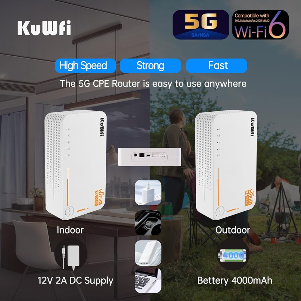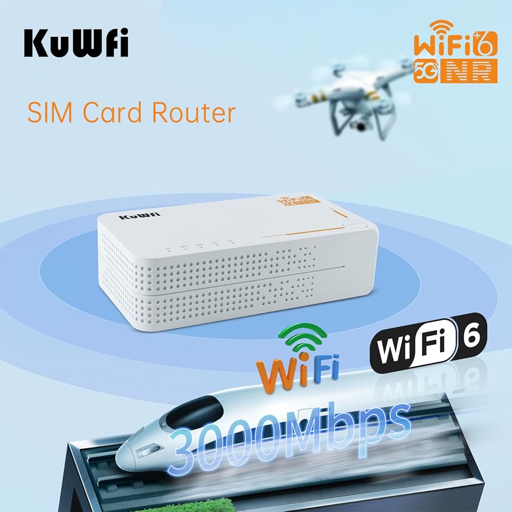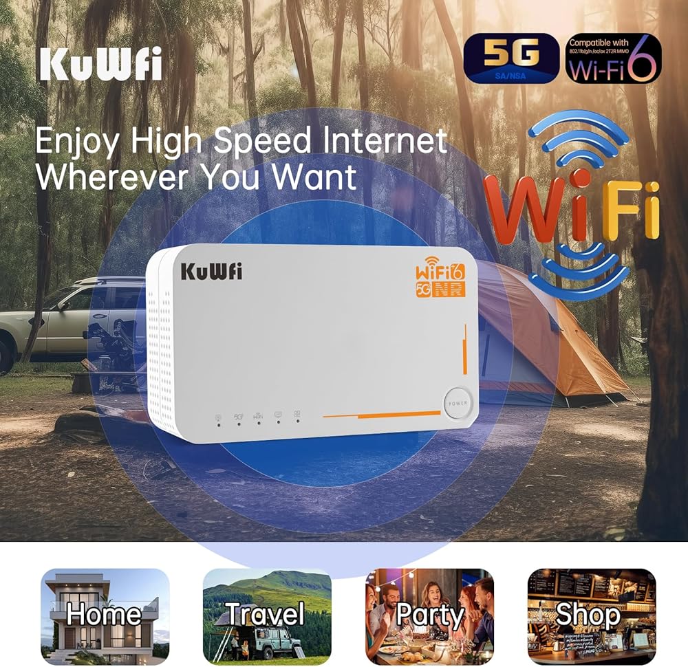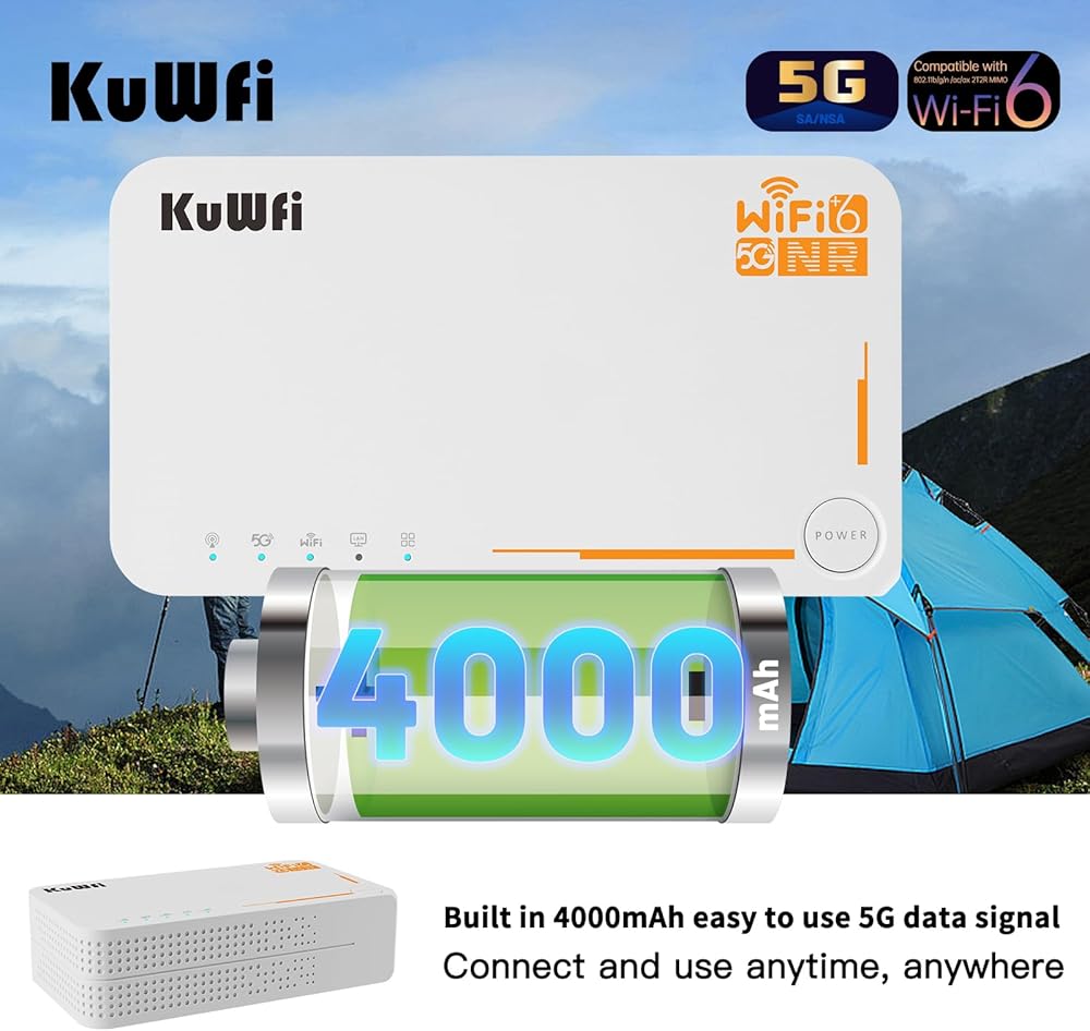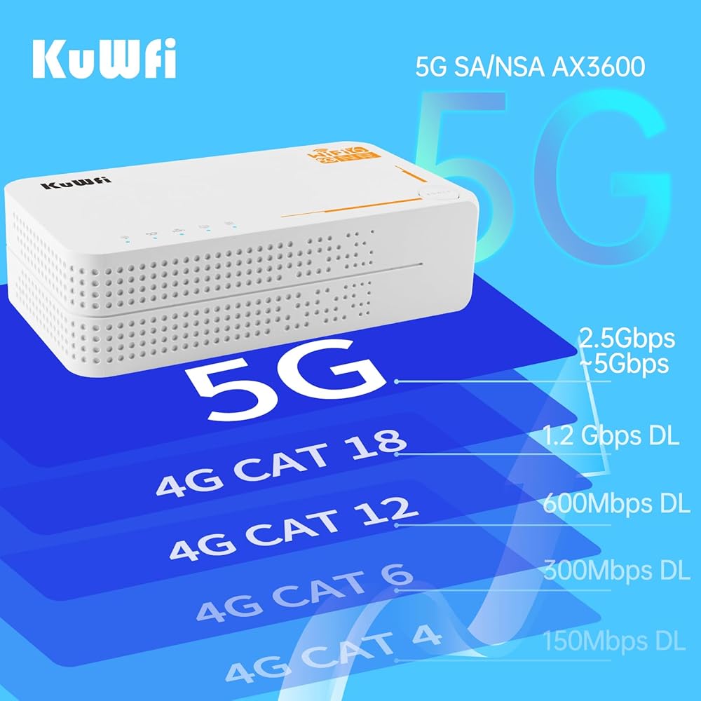 جهاز توجيه KuWFi 5G مع فتحة لبطاقة sim غير مقفلة، NR NSA/SA AX3600 لاسلكي 5G Wi-Fi 6 جهاز توجيه نقطة اتصال متنقل ثنائي النطاق جيجابت جهاز نقطة اتصال واي فاي محمول مع منفذ إيثرنت بطارية 4000 مللي أمبير في الساعة ويعمل بالتيار المستمر