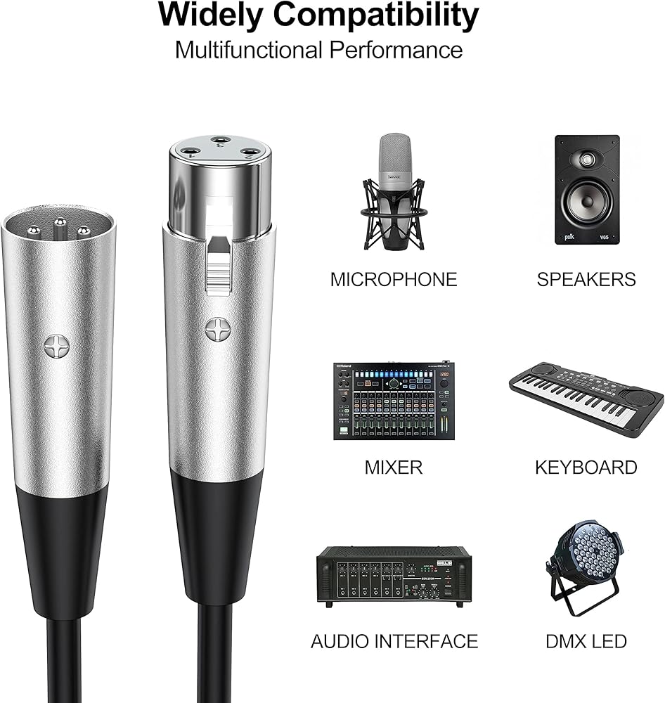 🎤توافق على نطاق واسع: كابلات XLR متوافقة تمامًا مع الأجهزة التي تحتوي على موصلات ذات 3 دبابيس، مثل الميكروفونات، وإضاءة المسرح، ومصابيح DMX، ووحدات التحكم في المزج، ومكبرات الطاقة، وإمدادات طاقة المصباح، ومكبرات الصوت، وما إلى ذلك. بالإضافة إلى ذلك، فإن كابلات الميكروفون هذه منتشرة على نطاق واسع تستخدم لمكبرات الصوت المسرحية ومراحل النادي وKTV والمسارح المنزلية وغيرها من البيئات.