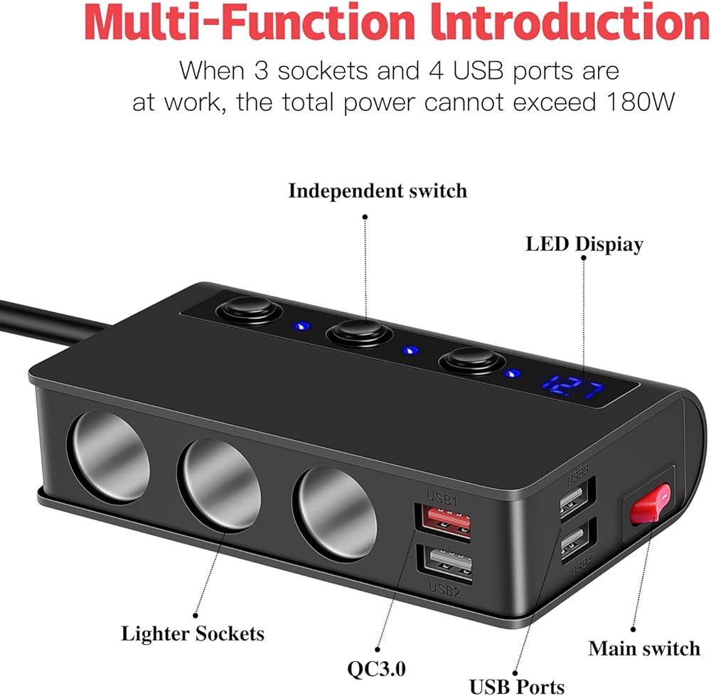 توفر 3 مقابس ولاعة سجائر إضافية لمنافذ التيار المستمر على المحول طاقة إخراج إجمالية تصل إلى 180 وات، تنطبق على معظم المركبات 12 فولت/24 فولت بما يكفي لنظام تحديد المواقع العالمي (GPS) وكاميرا لوحة القيادة وثلاجة السيارة ومرطب الهواء والمكنسة الكهربائية المثبتة على السيارة وما إلى ذلك في نفس الوقت.