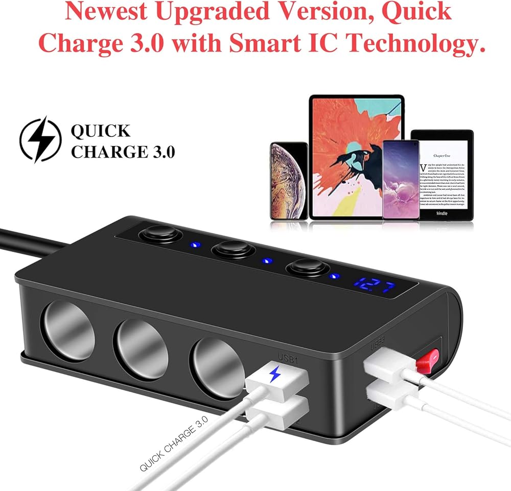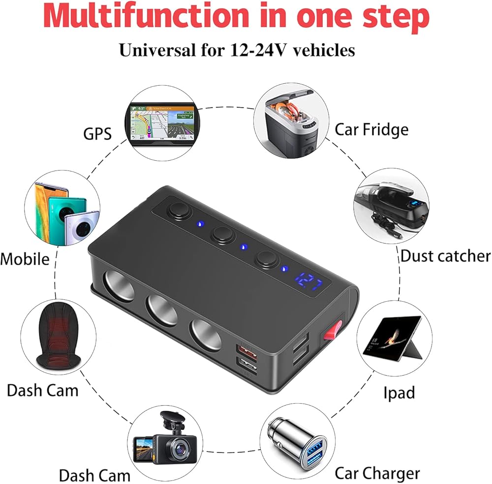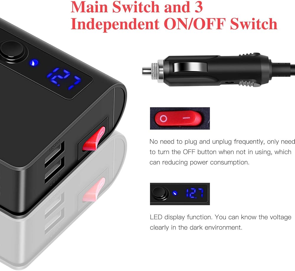 مفتاح رئيسي لشاحن السيارة بالكامل و3 مفاتيح مستقلة لكل مقبس سجائر، مما يوفر الطاقة ويقلل من التآكل ويطيل عمر أجهزتك في سيارتك. شاشة LED تراقب جهد بطارية سيارتك.