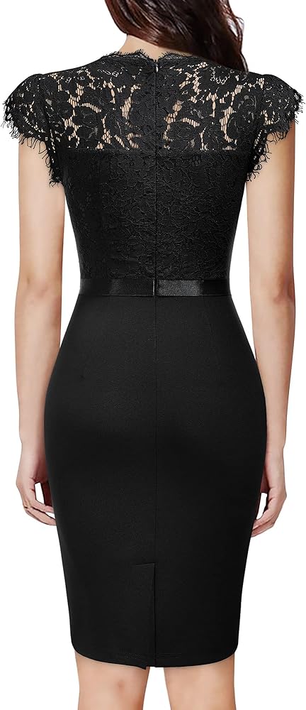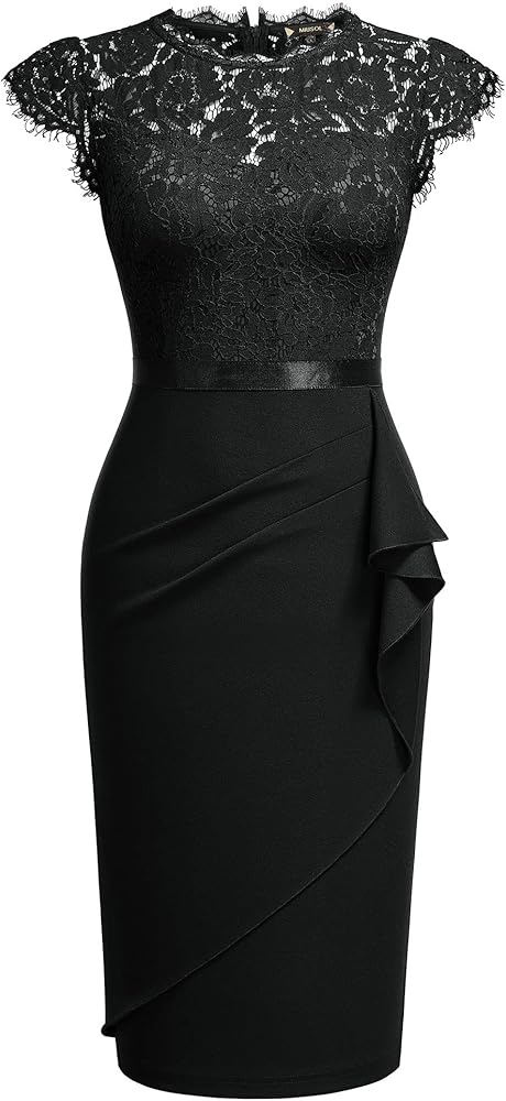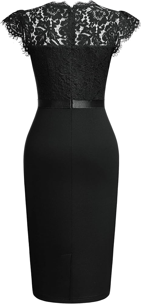 • رقبة دائرية من الدانتيل الكلاسيكي، أكمام قصيرة على شكل كاب، قصة نحيفة جذابة، سحاب على الظهر