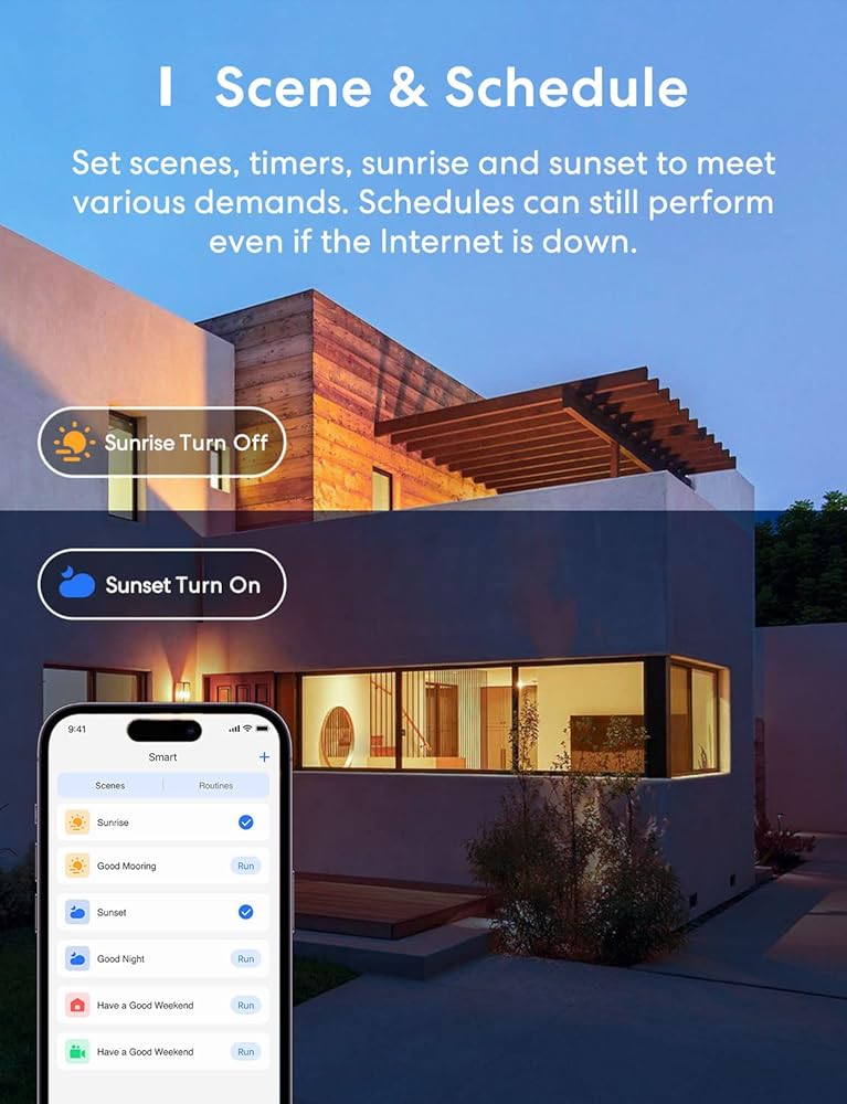 الجداول الزمنية وتوفير الطاقة: يمكنك ضبط الجداول الزمنية (المؤقتات) لتشغيل/إيقاف الإضاءة الذكية تلقائيًا بناءً على روتينك. وضع شروق الشمس/غروب الشمس مدعوم. سيتم بدء تشغيل الجدول الروتيني محليًا وسيظل يعمل حتى في حالة تعطل الإنترنت. فقط 9 واط من الطاقة المستهلكة، أي ما يعادل سطوع لمبة متوهجة 60 واط، توفر ما يصل إلى 8.19 دولارًا سنويًا.