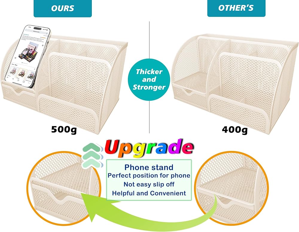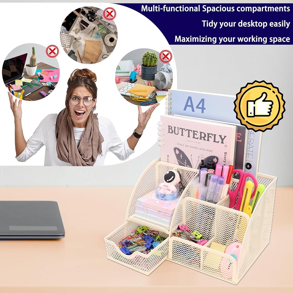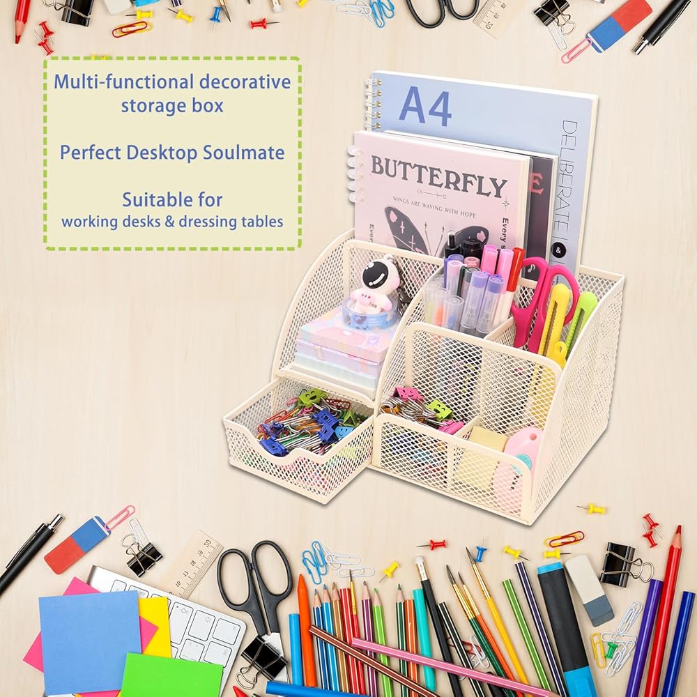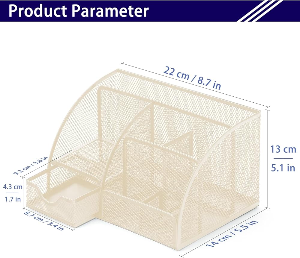 【تصميم موفر للمساحة】حجم مريح 8.7 بوصة × 5.5 بوصة × 5.2 بوصة لن يأخذ مساحة كبيرة للتخزين المريح والأنيق للهاتف المحمول، والأقلام، والمقص، والأشرطة، والكباسات، ومشابك الورق، والمسطرة، والملفات، وأجهزة الكمبيوتر المحمولة، وجميع ما لديك ملحقات مكتب المكتب. تساعد على ضمان أن يكون لكل شيء مكانه، وتجعل مساحتك أكثر نظافة ومرتبة.