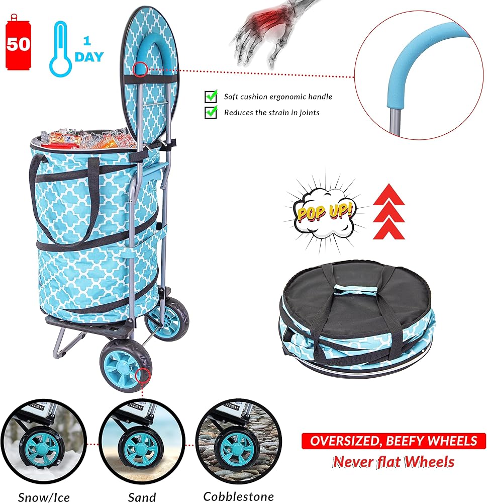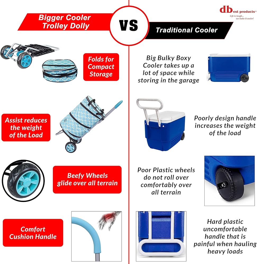 تحتوي عربة التبريد الأكبر حجمًا على حقيبة معزولة منبثقة قابلة للإزالة بالكامل على دمية قابلة للطي تعمل بكامل طاقتها. عربة دوللي قابلة للطي لتكون مضغوطة.