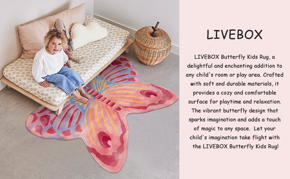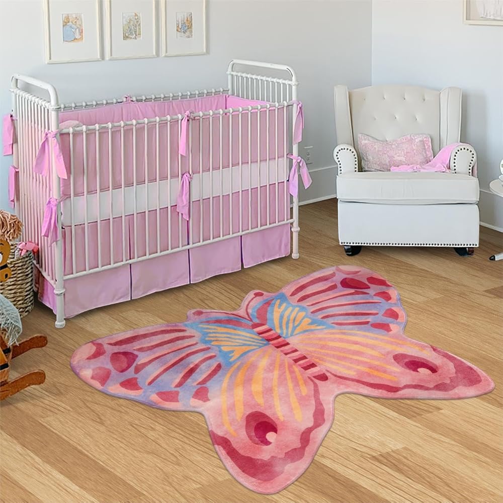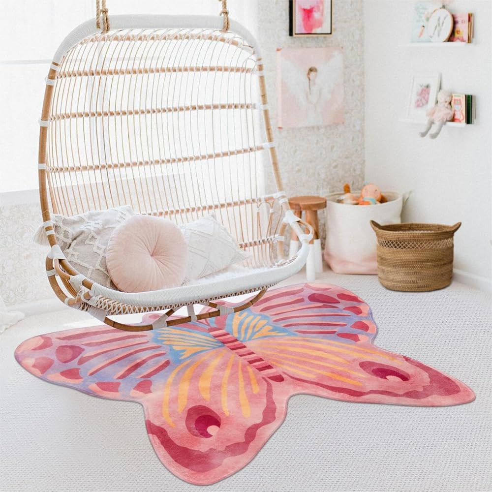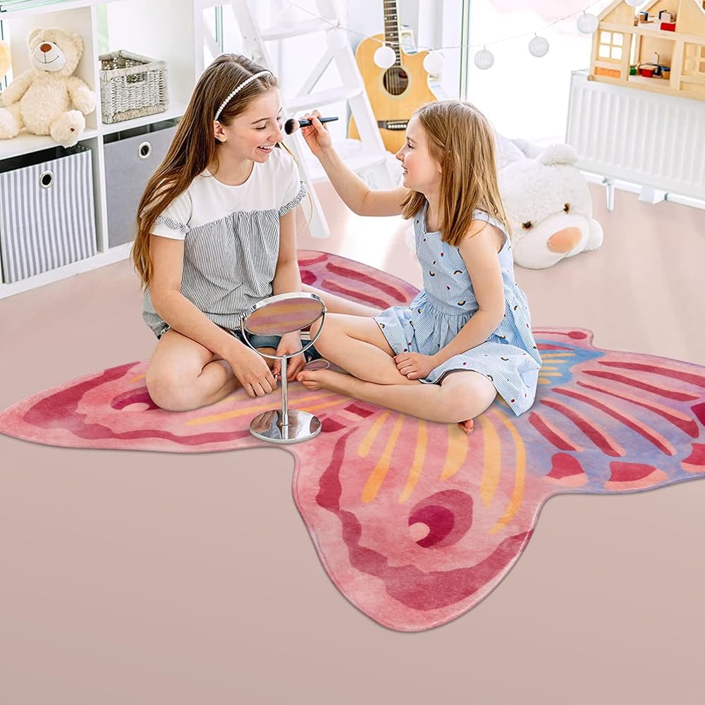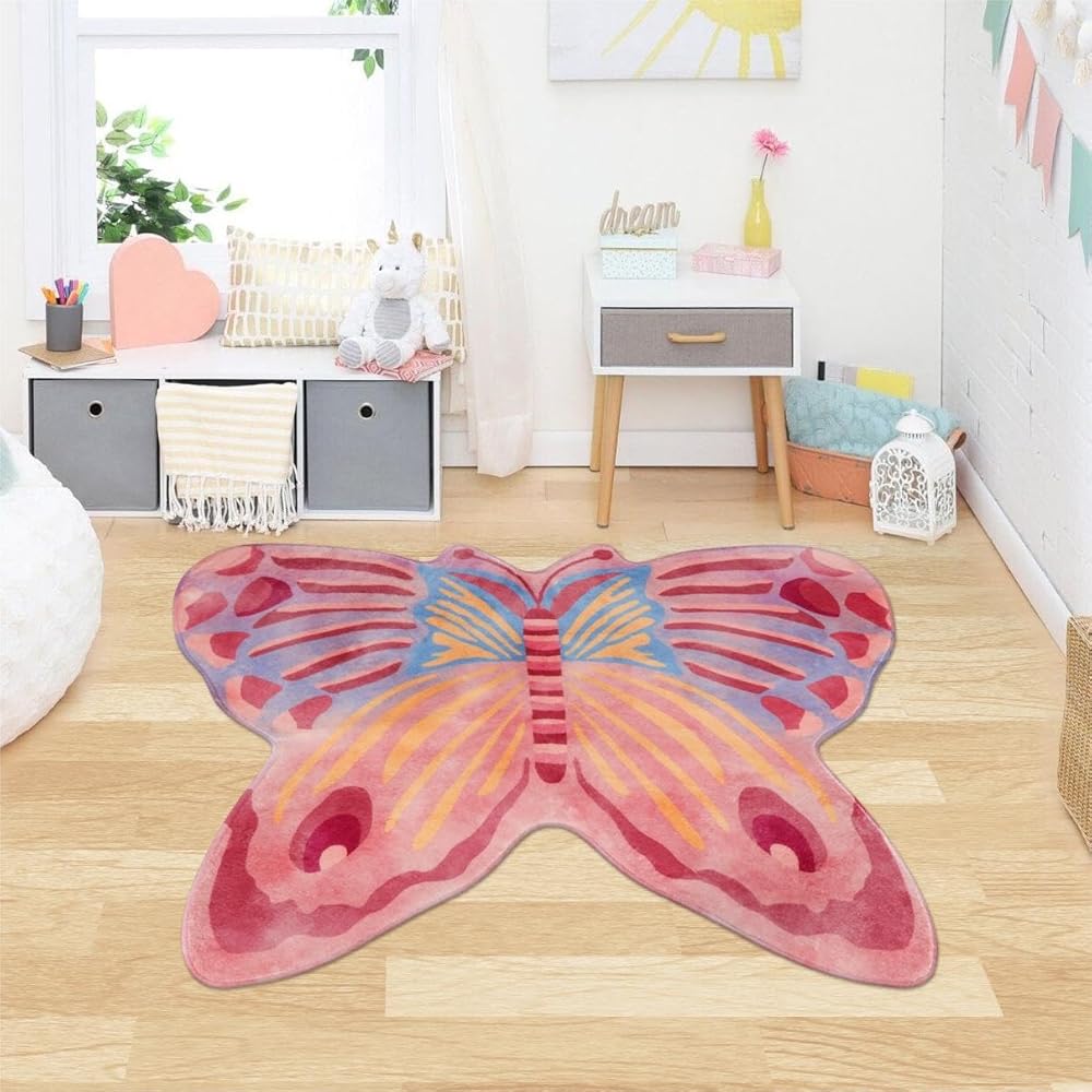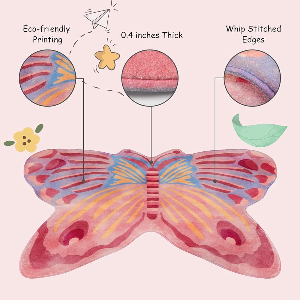 سجادة على شكل فراشة: مستوحاة من الفراشة، تم تصميم سجادة غرفة الفتيات على شكلها، مما يوفر عالم حيوانات ممتع وطبيعة ملونة للأطفال لتعزيز إبداعهم وحبهم للطبيعة.