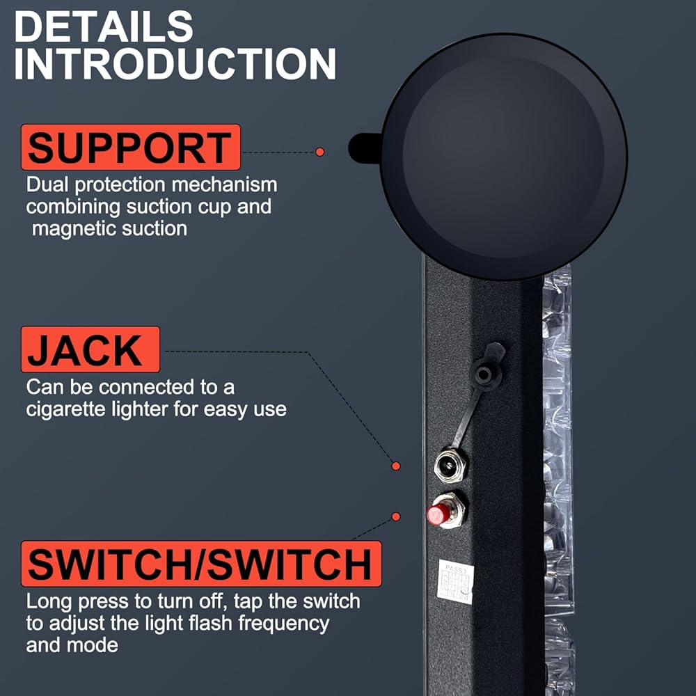 • مغناطيس قوي ومشرق للغاية: يتكون شريط الإضاءة القوية القابل لإعادة الشحن من 24 مصباح LED من كل مصباح LED عالي السطوع 3 وات. سيوفر مخرجات إضاءة فائقة السطوع في النهار أو في منتصف الليل. يتم تركيبه على أي سقف معدني مع حاملين مغناطيسيين. المدمج في 8 مغناطيس جذاب للغاية. 2 كوب شفط مطاطي سميك يمكن أن يزيد من قوة الشفط بشكل فعال. بالمقارنة مع الأنواع الأخرى من قضبان الإضاءة، يمكن تثبيتها مغناطيسيًا لحماية طلاء السيارة بشكل فعال ومنع الخدش.