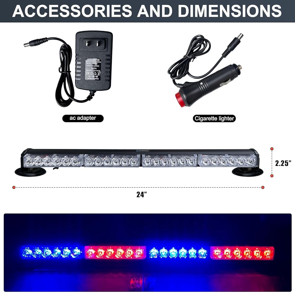 • مجموعة كاملة وسهلة التركيب: 1 × شريط أضواء الطوارئ القوية، 1 × شاحن ولاعة السيجار، 1 × شاحن قابس منزلي. أبعاد لوحة شريط الإضاءة القوية هذه: 24 بوصة (عرض) × 2.3 بوصة (عمق) × 2.25 بوصة (ارتفاع). شائع في جميع المركبات أو المقبس المنزلي المزود بمصدر طاقة 12 فولت. شريط الإضاءة القوية بالبطارية سهل التركيب وسهل الاستخدام يستغرق الأمر 5 دقائق فقط لإكمال التثبيت، وهو رائع لمركبات الطوارئ والخدمة البريدية ومركبات البناء ومحراث الثلج والتحذير من سلامة الشاحنات وما إلى ذلك.