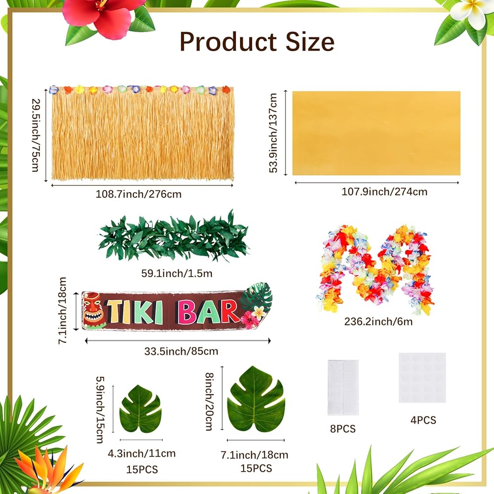 معلومات المقاس: حجم كوخ تيكي بار النهائي هو 36.6 × 20 × 53.1 بوصة، تنورة الطاولة 108.7 × 29.5 بوصة، لافتة تيكي 33 × 7 بوصة، مفرش المائدة 86 × 51 بوصة؛ يبلغ طول أكاليل الزهور وسلسلة إضاءة LED 3 أمتار وشرائط الأوراق الاصطناعية 1.5 متر. الحجم المناسب يمكن أن يحول أي مساحة إلى جنة هاواي - أضف إكسسوارات وديكورات بار تيكي لتعزيز الجو العام وخلق تجربة احتفالية مخصصة