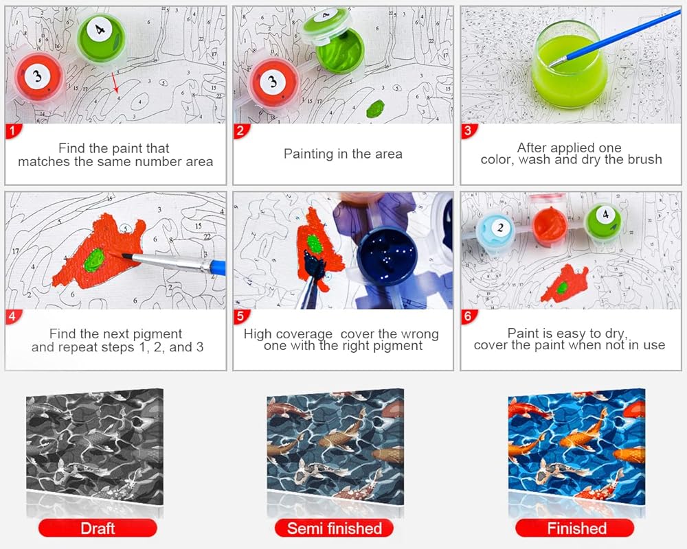 • 🎨 مجموعة الطلاء بالأرقام: تتضمن لوحة قماشية مقاس 40.64 سم × 50.8 سم (بدون إطار)، و3 فرش رسم، ومجموعة واحدة من ألوان صبغة الأكريليك وعينة من الصورة. ستجعلك مجموعات الطلاء بالأرقام تشعر بالسحر والمرح فن.