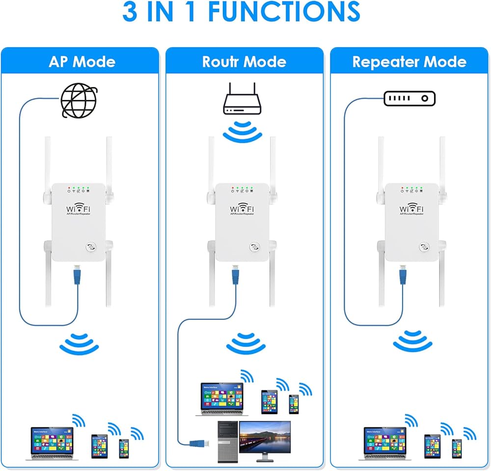 3 أوضاع عمل وفقًا للاحتياجات: وضع مكرر / جهاز التوجيه / نقطة الوصول اللاسلكية، والذي يلبي متطلبات الشبكة المختلفة. يعمل معزز الإشارة اللاسلكية مع جميع الشبكات اللاسلكية وأجهزة التوجيه والأجهزة التي تدعم WiFi، بما في ذلك الأجهزة المنزلية الذكية والهواتف الذكية وEcho وAlexa وأجهزة الكمبيوتر المحمولة وغيرها.