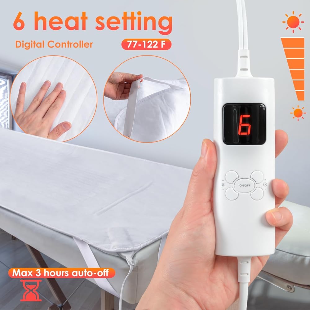 يناسب معظم أسرة السبا. تم تصميمه ليناسب طول وعرض معظم طاولات التدليك، حيث يوفر جهاز تدفئة الطاولة سهل الاستخدام مقاس 72.8 × 30 بوصة أفضل مزيج. لا تغسل في الغسالة أو التنظيف الجاف.