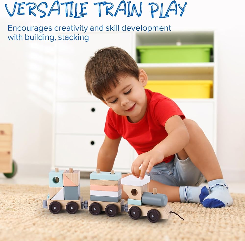 قطار التكديس من أومو - لعبة خشبية كلاسيكية (17 قطعة) - مجموعة قطارات، ألعاب فرز وتكديس خشبية للأطفال الصغار من عمر سنتين فما فوق، متعددة الألوان