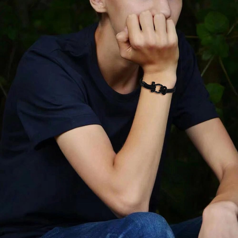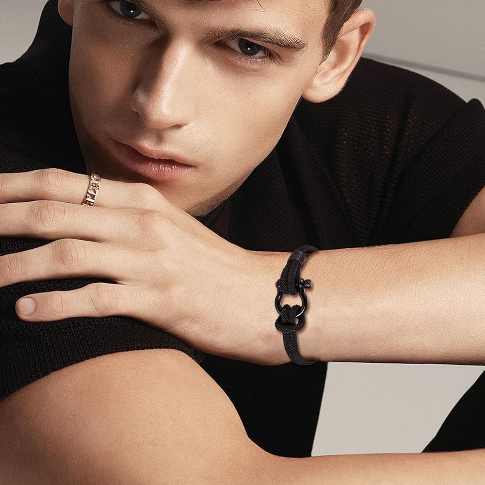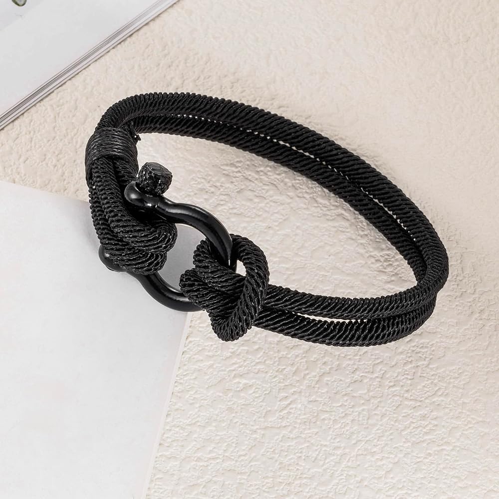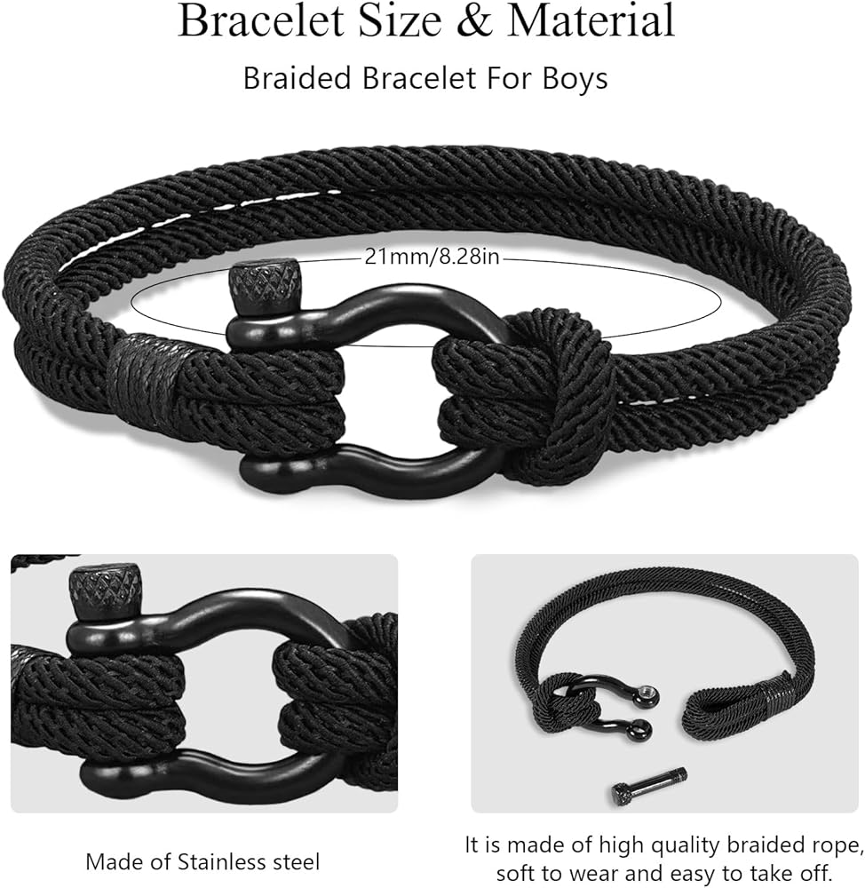 【الخامة والمقاس】مصنوع من مشبك فاشيت من الفولاذ المقاوم للصدأ، وحبل عالي الجودة. إنها مصنوعة بشكل جيد وقوية ومتينة وصديقة للبشرة ولا تسبب الحساسية. ناعم ومريح للارتداء اليومي. يمكن مواءمته بسهولة مع الملابس اليومية المختلفة، ومناسب لأي مناسبة. يبلغ حجم السوار حوالي 8.7 بوصة، ويناسب معظم معاصم الرجال والأولاد. قم بفك المشبك يمكنك فتحه بسهولة.