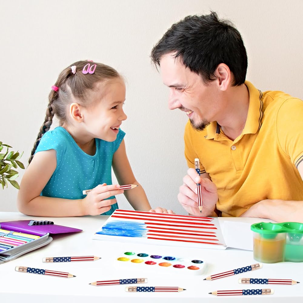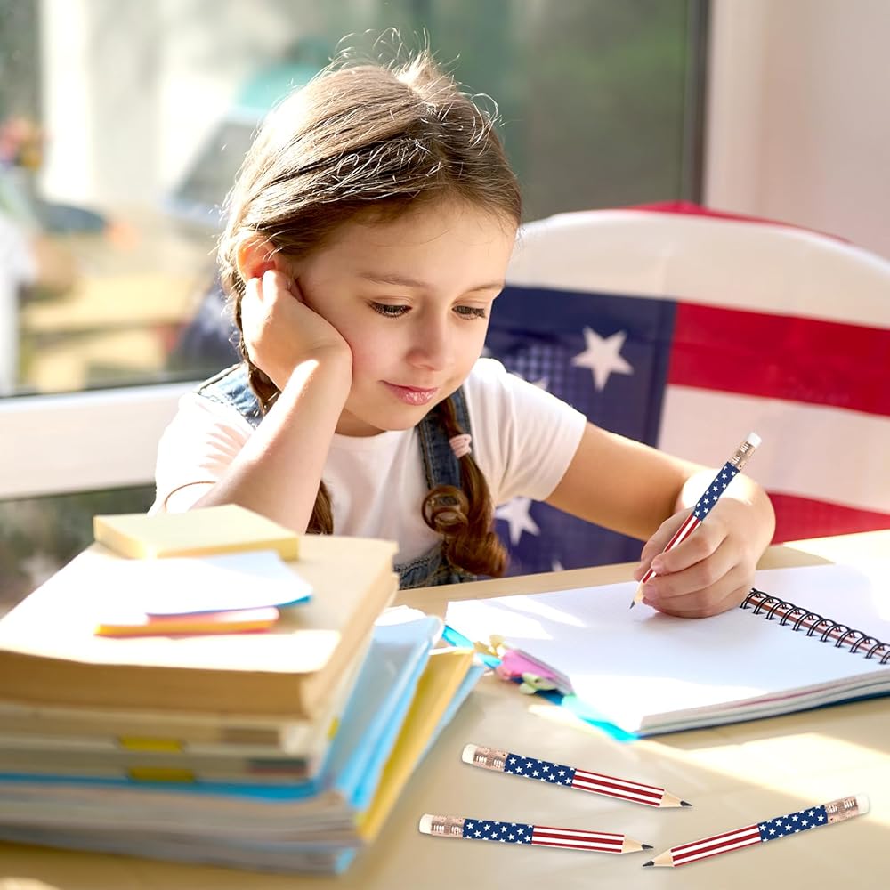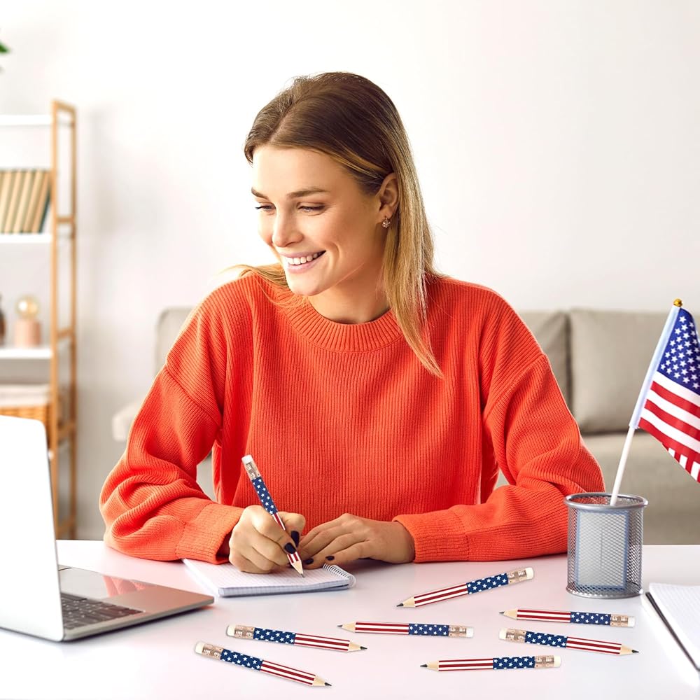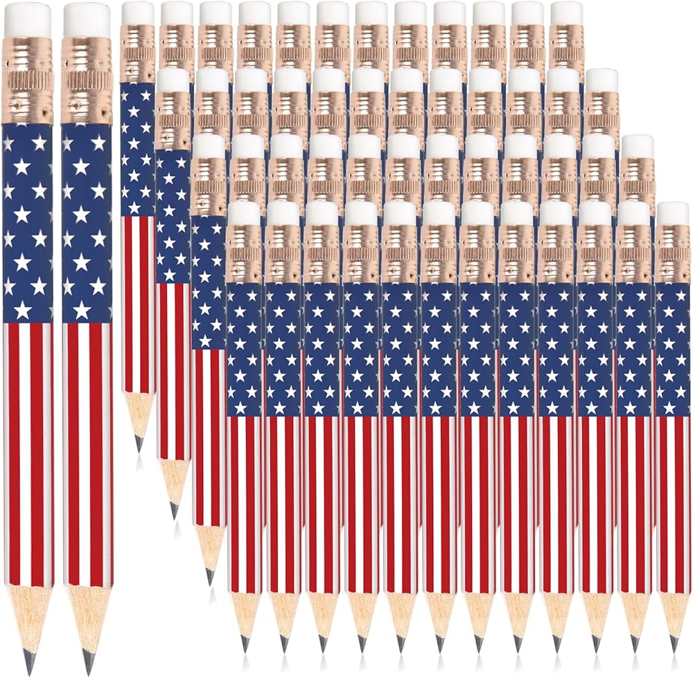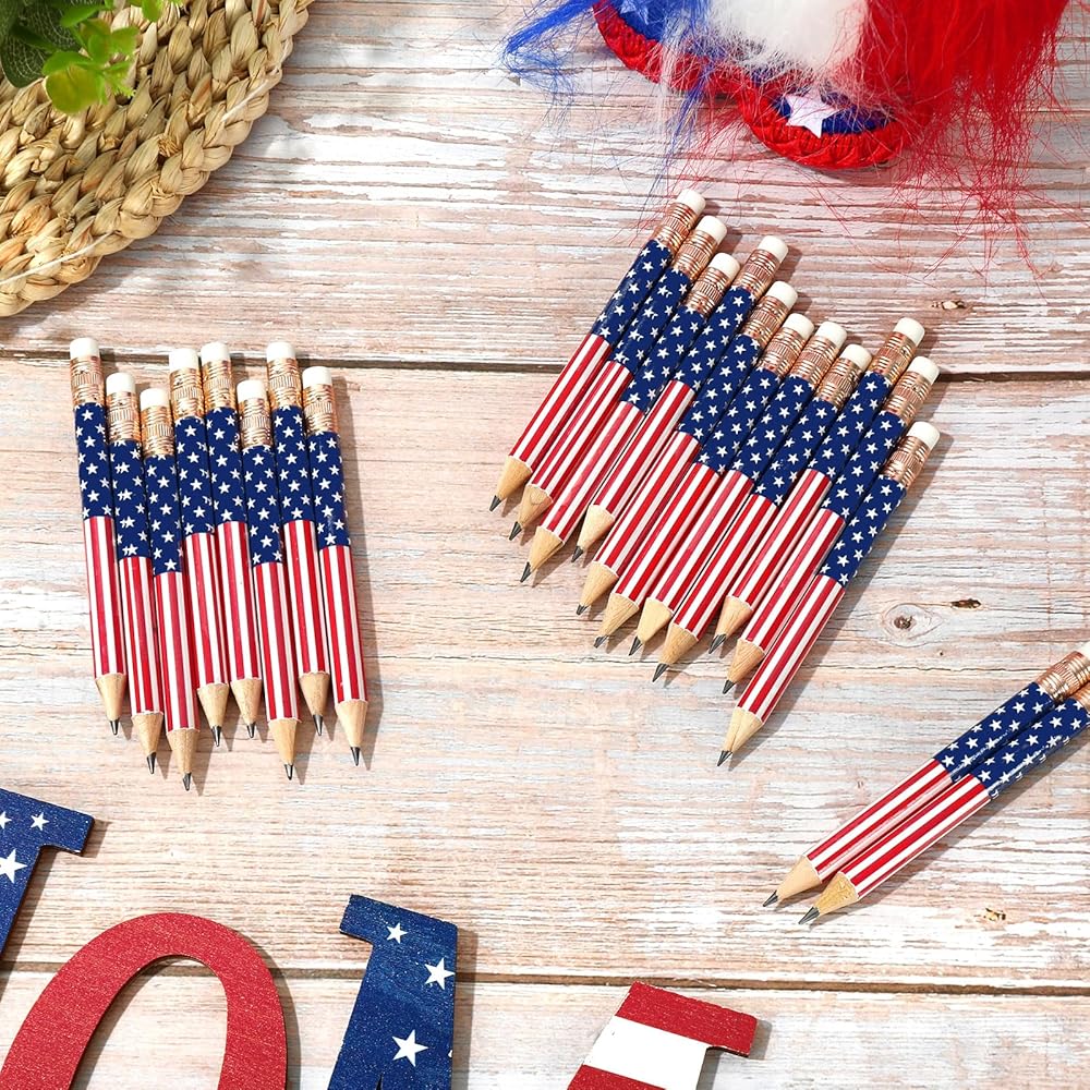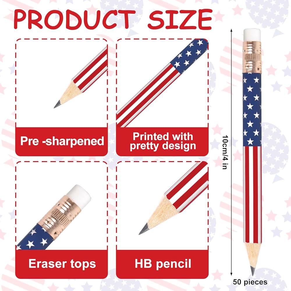 50 قطعة قلم رصاص ليوم الاستقلال مع محايات، أقلام كتابة قصيرة بعلم أمريكي، أحمر أبيض وأزرق، نصف أقلام رصاص وطنية لمستلزمات القرطاسية المكتبية المدرسية في الرابع من يوليو، 4 بوصات