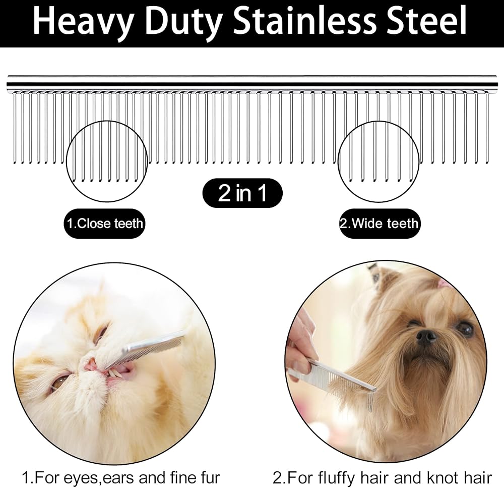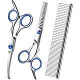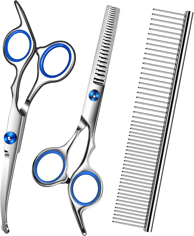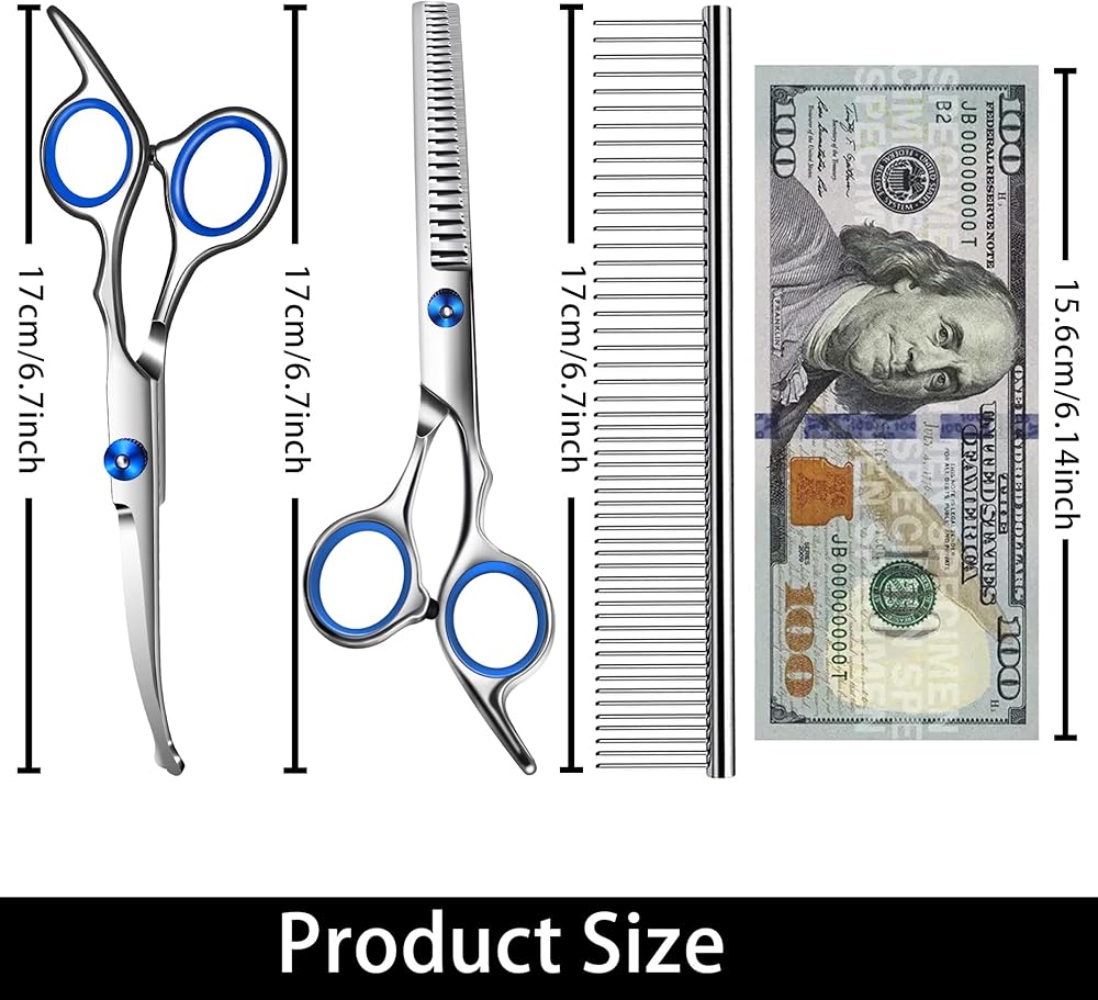 مجموعة مقصات الحيوانات الأليفة: تشتمل مجموعة مقصات العناية بالحيوانات الأليفة على مقصات تخفيف مقاس 6.7 بوصة، ومقصات منحنية مقاس 6.7 بوصة، ومقص مستقيم مقاس 6.7 بوصة، ومشط حلاقة مقاس 6.5 بوصة. يمكنها أن تجعل حيواناتك الأليفة تبدو أكثر جمالاً.