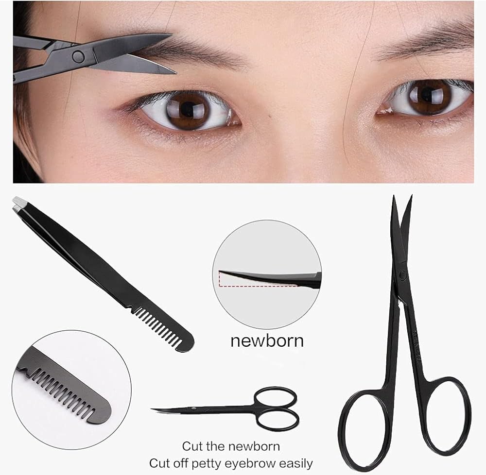 مقص الحواجب مع ملقط مشط، متعدد الأغراض من الفولاذ المقاوم للصدأ منحني مقص رموش صغير مشط ملقط للنساء الحاجب رمش تجميل الوجه (أسود)