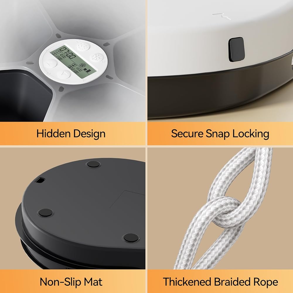 الصمت وسهولة الإعداد: وحدة تغذية الحيوانات الأليفة القابلة للبرمجة من أفضل معهد أبحاث UBTECH في الصين. يمكنك إعداد التغذية طوال اليوم بخطوات بسيطة، حتى تتمكن من مغادرة المنزل بسلام. (عملية التغذية <40 ديسيبل)