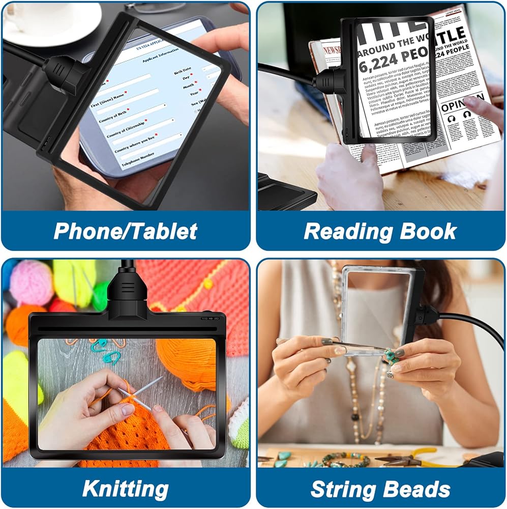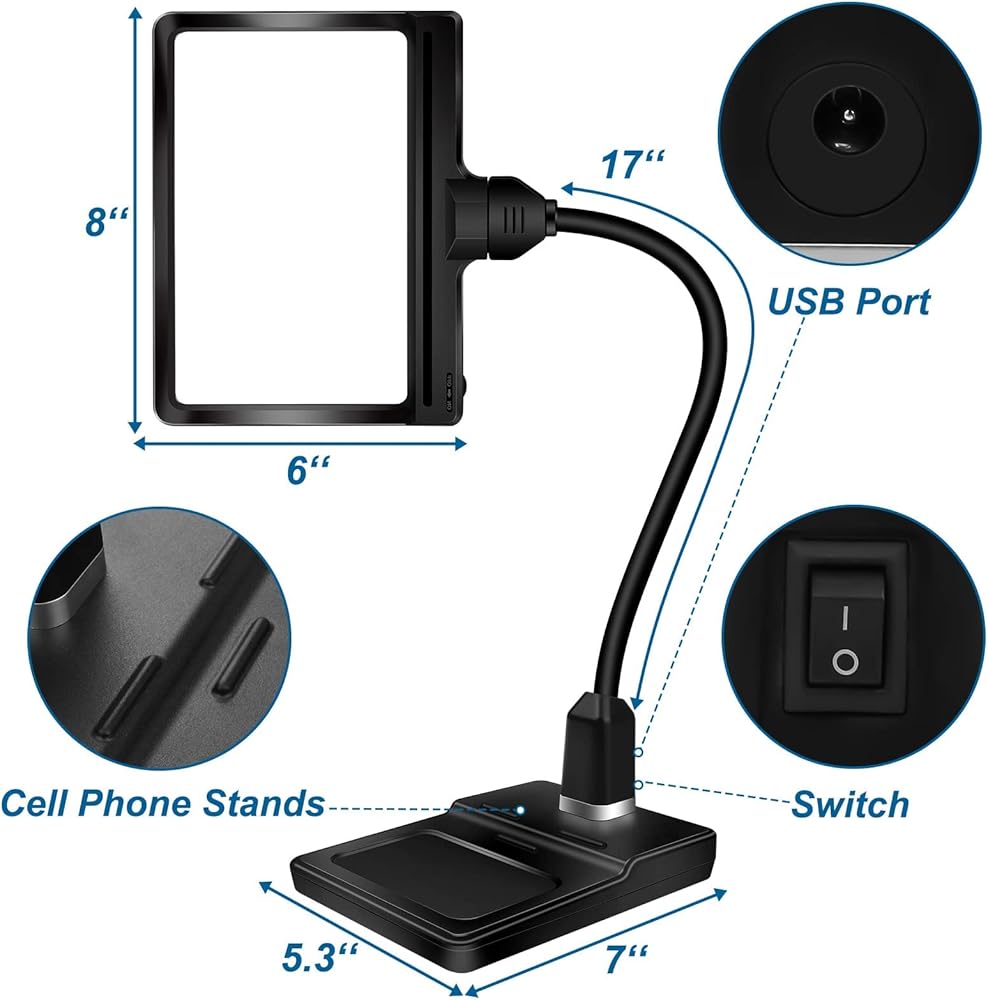 رقبة الإوزة المرنة ومجال رؤية كبير: يمكن أن تدور رقبة الإوزة المصنوعة من الألومنيوم عالي الجودة مقاس 17 بوصة بزاوية 360 درجة وتوفر ثباتًا ممتازًا. فهو يحرر يديك، مما يسمح لك بالاستمتاع بأنشطتك المفضلة. تغطي العدسة المكبرة مساحة عرض كبيرة مقاس 8x6 بوصة، مما يجعلها مثالية لكبار السن والفنانين وهواة جمع العملات المعدنية والمزيد. إذا لم تكن راضيًا عن منتجنا، فلا تتردد في الاتصال بنا في أي وقت.