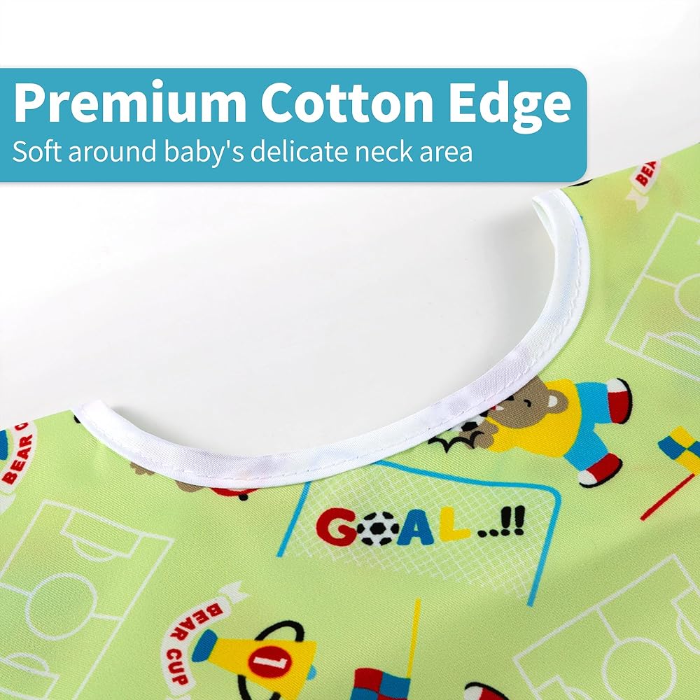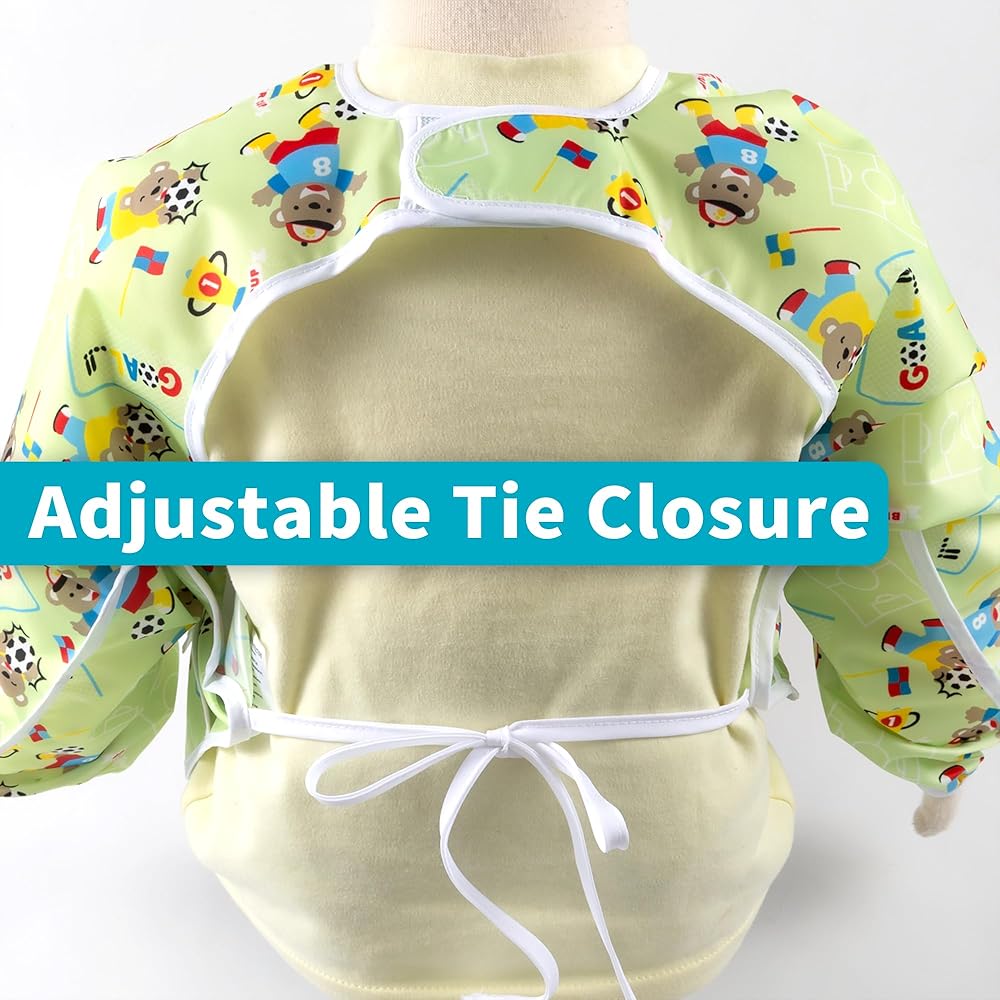 【آمن ومريح】 - مصمم خصيصًا بحزام لاصق طويل جدًا وقوي حول الرقبة، وربطة عنق حول الخصر، جميع الحواف ناعمة لضمان ملاءمة آمنة ومخصصة، وبدون أي إزعاج محتمل حول الرقبة. تساعد الكفة المرنة غير المريحة على منع الطعام من الوصول إلى الأكمام.