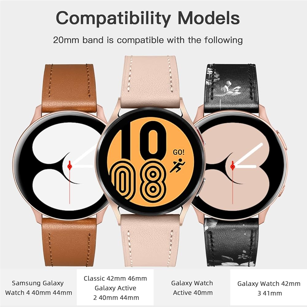 ✅[نماذج التوافق] يتوافق السوار الجلدي الخاص بنا مع ساعة Samsung Galaxy Watch 5 40 مم 44 مم/Galaxy Watch 6 40 مم 44 مم/Galaxy Watch 5 Pro 45 مم/Samsung Galaxy Watch 4 44 مم 40 مم/Galaxy Watch 6 Classic 47 مم 43 مم/Galaxy Watch 4 Classic 46 مم 42 مم /Galaxy Active 2 40 مم 44 مم/Galaxy Watch 42 مم/Galaxy Watch 3 41 مم/Gear Sport/Gear S2 Classic وMoto 360 الجيل الثاني 42 مم وساعات ذكية أخرى بعرض شريط 20 مم مع عروات. يرجى التحقق من طراز ساعتك قبل شرائها