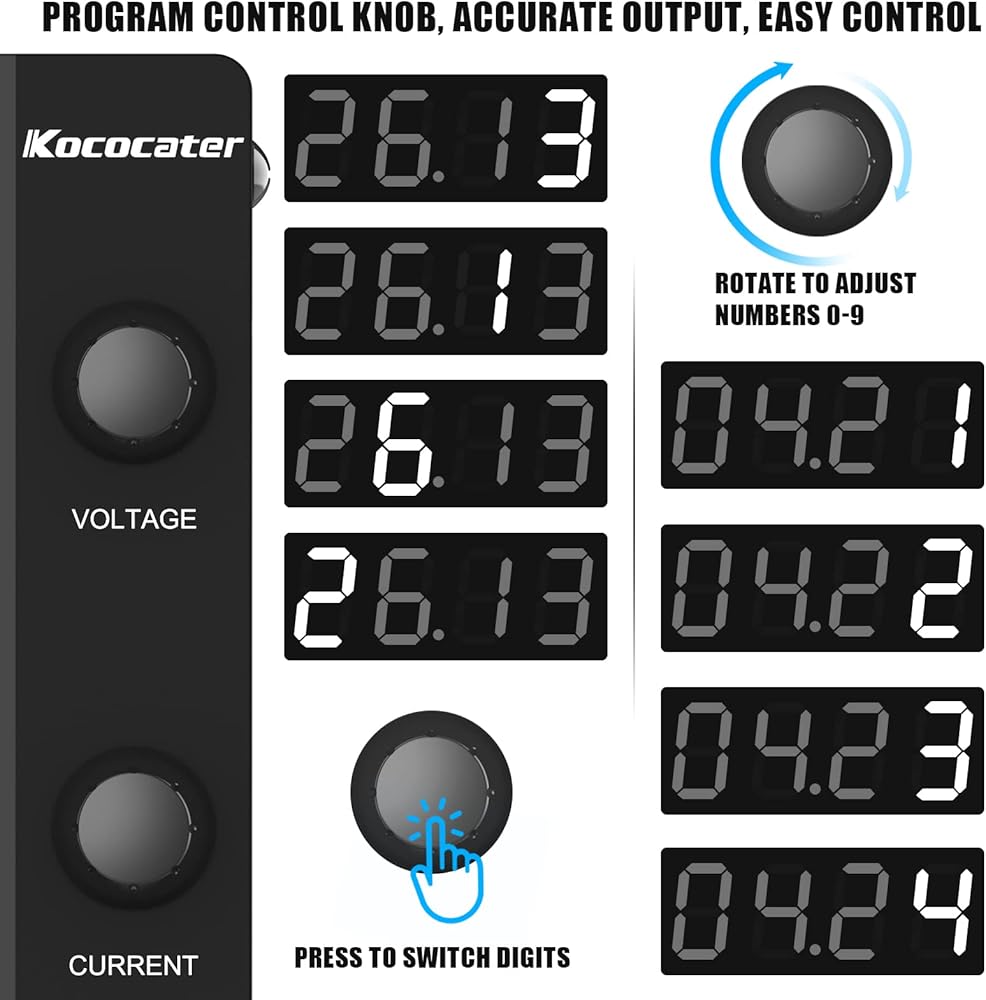 شاشة عرض الطاقة ذات 4 أرقام عالية الدقة: مصدر الطاقة IKococater 120V 3A DC هو جهاز تنظيم إمداد الطاقة الاحترافي الذي يتمتع بدقة عالية تبلغ 0.1 فولت و0.001 أمبير. يمكنك ضبطه بسهولة ضمن 0-120 فولت و0-3 أمبير. توفر شاشة LED ذات الإضاءة الخلفية المكونة من 4 أرقام قراءة أكثر دقة للجهد والقيمة الحالية، ويمكن رؤيتها بسهولة حتى في ظروف الإضاءة المنخفضة.
