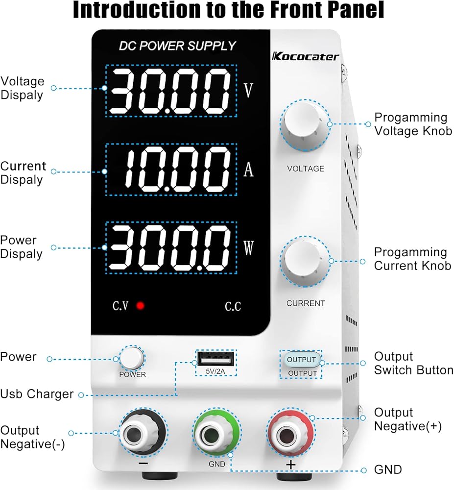تطبيق مدمج ومتنوع: مصدر طاقة IKococater DC أقل من 3 أرطال ويبلغ مقاسه 9.5 × 3.4 × 6.1 بوصة فقط، وينطبق على المختبر، والمدرسة، والإصلاح، والتحليل الكهربائي، والطلاء الكهربائي، وطلاء الفرشاة، واختبار المصباح، واختبار الشيخوخة، وشحن البطارية، والمنزل DIY وغيرها من المتطلبات. يمكن لواجهة USB 5V/2A شحن هاتفك الخلوي وتوفير الطاقة للجهاز الذي تريد إصلاحه، فلا داعي للقلق بشأن نفاد الطاقة.