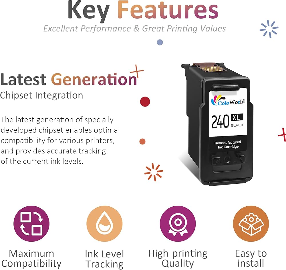 استبدال خرطوشة الحبر المعاد تصنيعها من ColoWorld لـ Canon 240 PG-240XL لطابعة Pixma MG3620 MG3600 MX452 MG2120 MG3520 MX472 MG3220 MX432 MG2220 MX512 MG3122 MG3222 MG3120 (1 أسود)