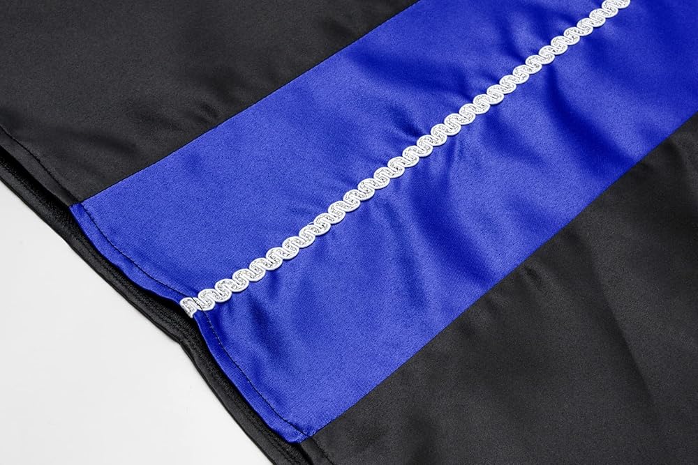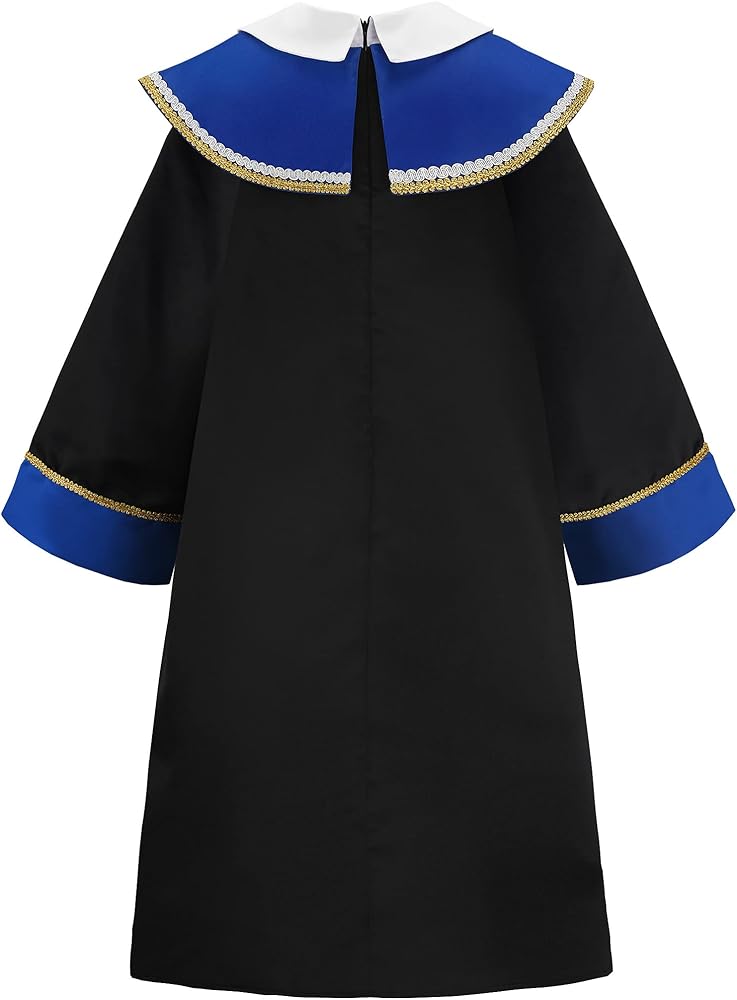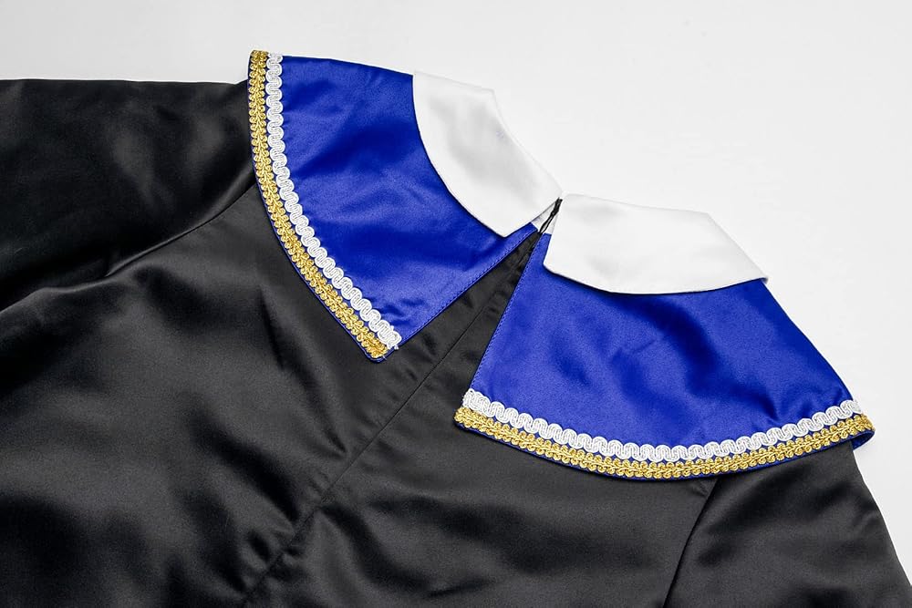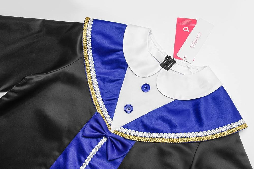 • السمات: تصميم مزيف من قطعتين لجعل الملابس أكثر رسمية، طوق القميص هو تصميم طوق دمية لطيف؛ تضيف زخرفة الأزرار والأقواس ذات اللون الأزرق الملكي إحساسًا بالحيوية والمرح؛ زخرفة الشريط الذهبي تجعل الملابس أكثر جمالاً ورائعة