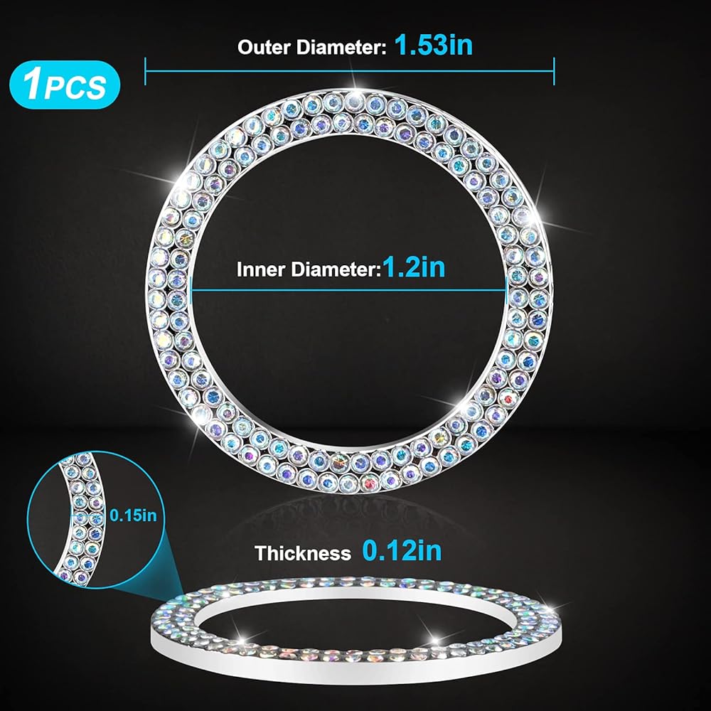 الحجم: القطر الخارجي للحلقة 1.53 بوصة؛ القطر الداخلي للحلقة 1.25 بوصة؛ السمك 0.15 بوصة. صغير ولطيف بالإضافة إلى تصميم بلينغ، يبدو مبهرًا مثل الجوهرة، جذاب للغاية، إذا قمت بتركيبه في سيارتك، سيصبح منظرًا طبيعيًا في السيارة. إنها مصنوعة من معدن الكروم المتين المقاوم للصدأ خاتم سيدوم بالتأكيد بشكل رائع عامًا بعد عام.