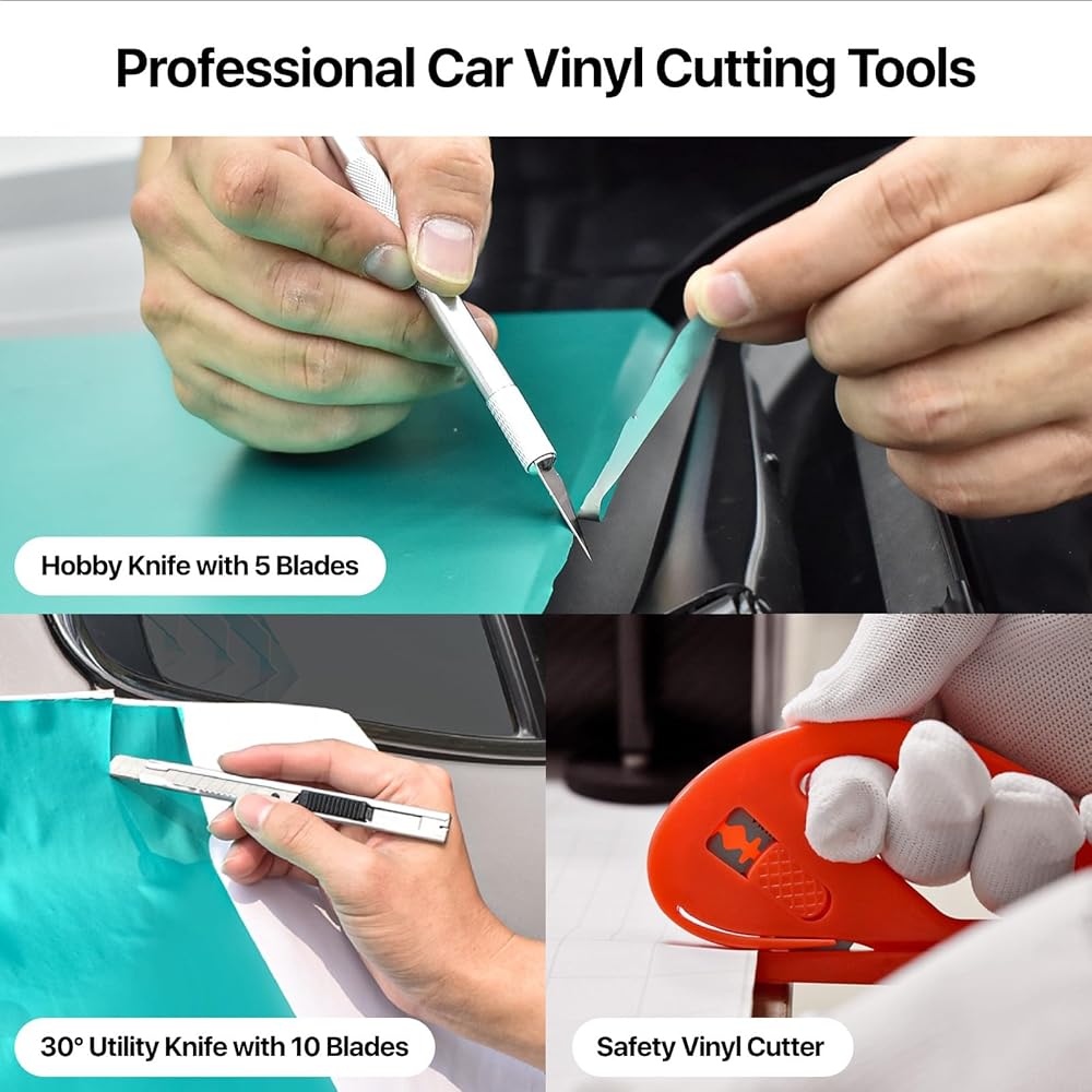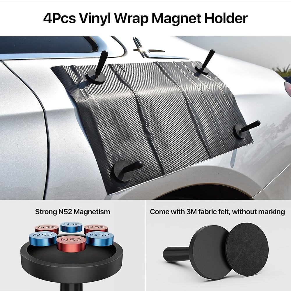 【مجموعة تغليف تظليل عالية الجودة للسيارات】أدوات الممسحة مصنوعة من مادة أكريلونتريل بوتادين ستايرين والمطاط واللباد. السكين الحرفي وشفرات السكاكين مصنوعة من الفولاذ عالي الكربون. حاملات مغناطيسية من الفينيل تتميز بمغناطيسية جيدة وتصميم وسادة سميكة دون أي علامات على السيارة.