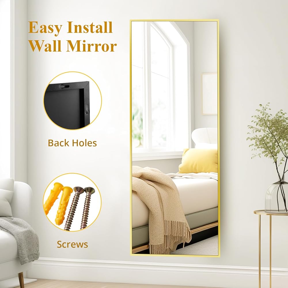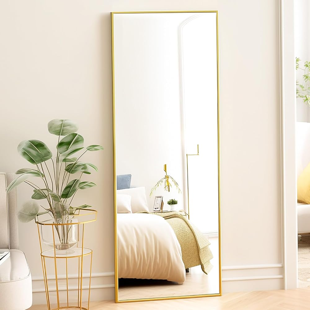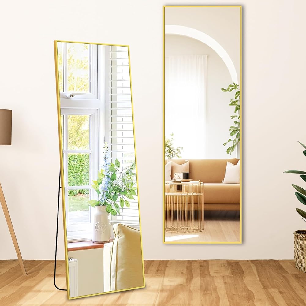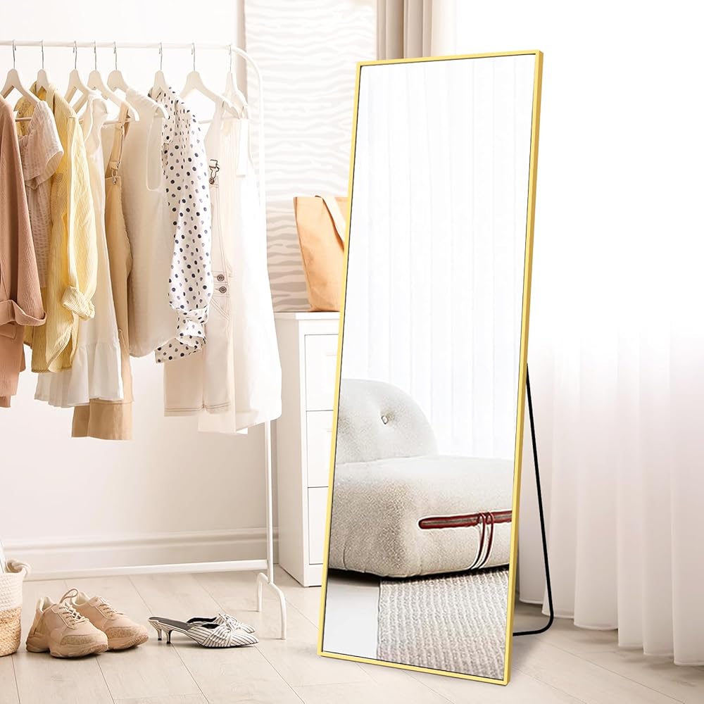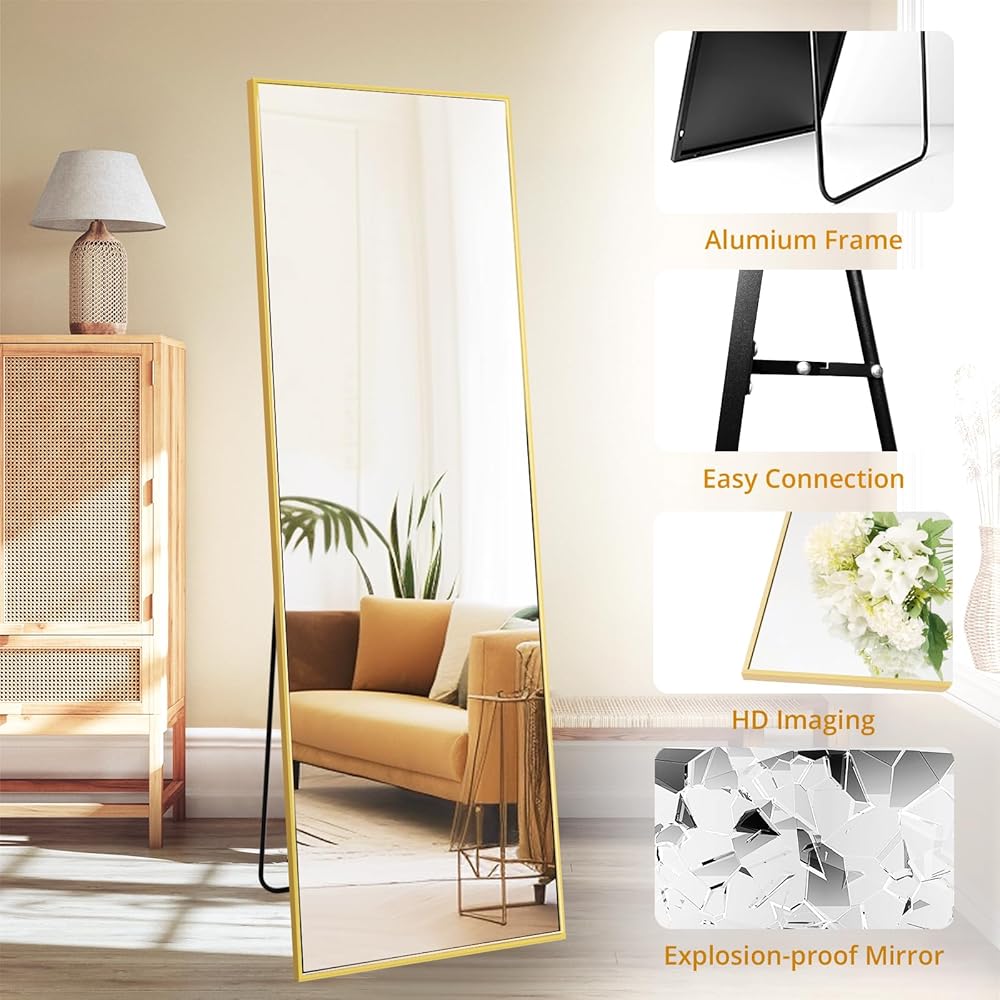 مرآة أرضية Fabuday كاملة الطول مع حامل - مرايا جسم ذهبية مقاس 64 بوصة × 21 بوصة لغرفة النوم وغرفة المعيشة، مرآة طويلة مؤطرة كبيرة الحجم كاملة، واقفة، معلقة، مائلة، إطار من سبائك الألومنيوم