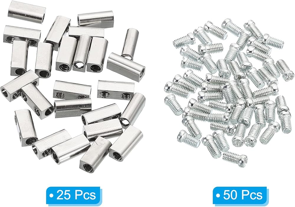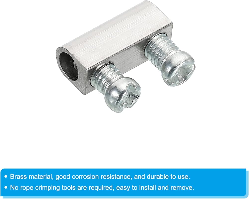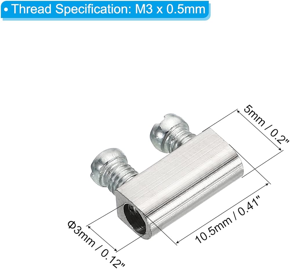 مواصفات الخيط: M3 × 0.5 مم؛ الحجم الكلي: 10.5 × 5 مم / 0.41 × 0.2 بوصة (الطول × العرض)؛ قطر فتحة السلك: 3 مم / 0.12 بوصة؛ طول المسمار الإجمالي: 7 مللي متر/0.28 بوصة ؛ اللون: لون فضي؛ المادة: نحاس؛ قائمة التعبئة: 25 قطعة × مشبك حبل سلكي، 50 قطعة × سدادات لولبية نهاية