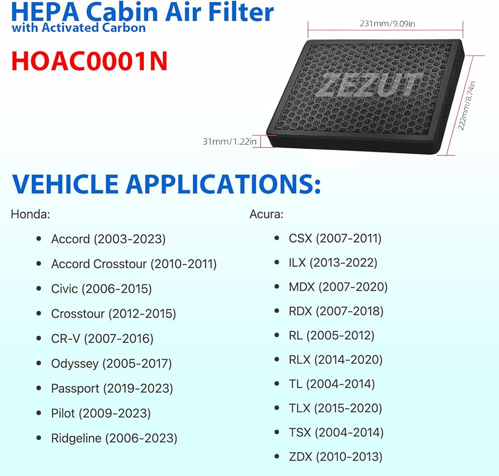• يتوافق فلتر هواء المقصورة ZEZUT مع موديلات السيارات التالية: HONDA ACCORD؛ 2006-2015 هوندا سيفيك; 2012-2015 هوندا كروس تور؛ 2007-2016 هوندا CR-V؛ 2005-2017 هوندا أوديسي؛ 2019-2022 هوندا جواز السفر؛ 2009-2022 هوندا بايلوت؛ 2006-2014,2017-2022 هوندا ريدجلاين