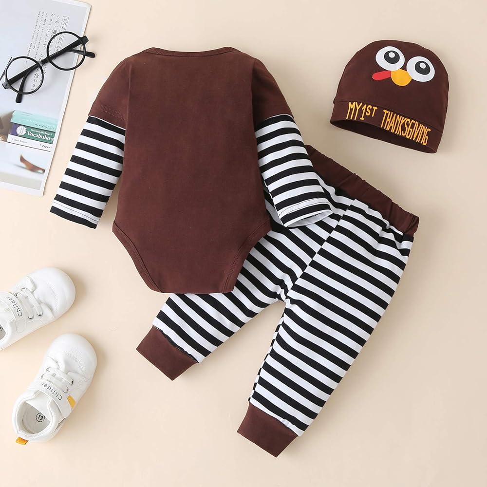 قمصان رومبر مطبوعة بحروف "My First Thanksgiving Day"، بدلة طويلة الأكمام لعيد الشكر للأطفال حديثي الولادة، طفلة رضيعة، تتناسب مع مجموعة ملابس سراويل ديك رومي مخططة لعيد الشكر.
