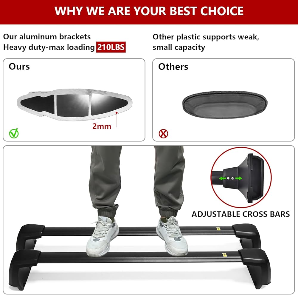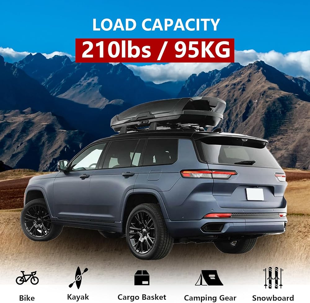 【قوي ومتين】: رف السقف الخاص بنا مصنوع من سبائك الألومنيوم عالية الجودة مع دعامات متينة يمكنها حمل ما يصل إلى 210 رطل (95 كجم). رف السقف مطلي بمسحوق أسود لجعله مقاومًا للماء والتآكل. بالإضافة إلى ذلك، يضمن تصميم المشبك عالي التحمل تثبيته بشكل آمن على القضبان الجانبية الموجودة، مما يضيف المزيد من الأمان والمتانة.